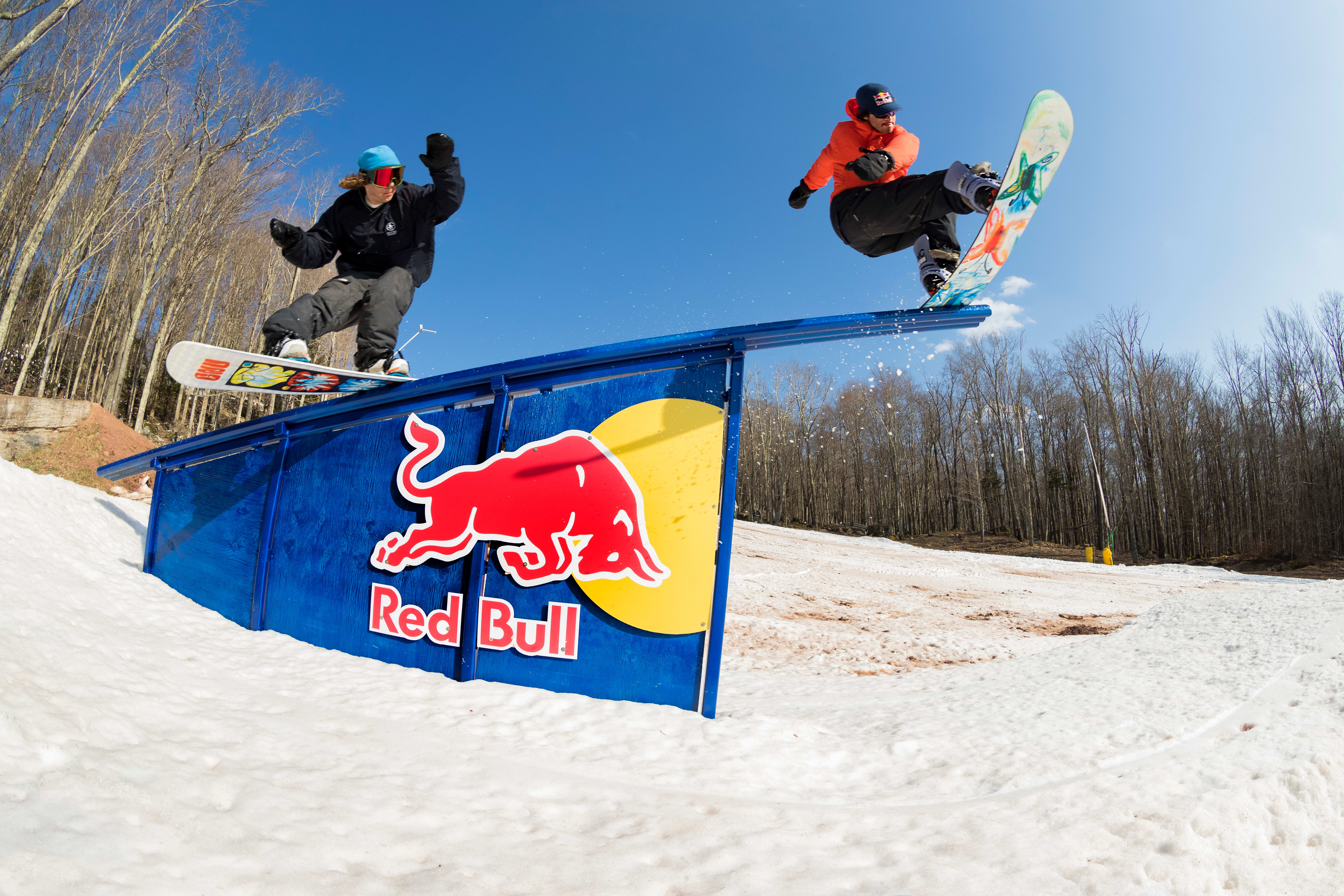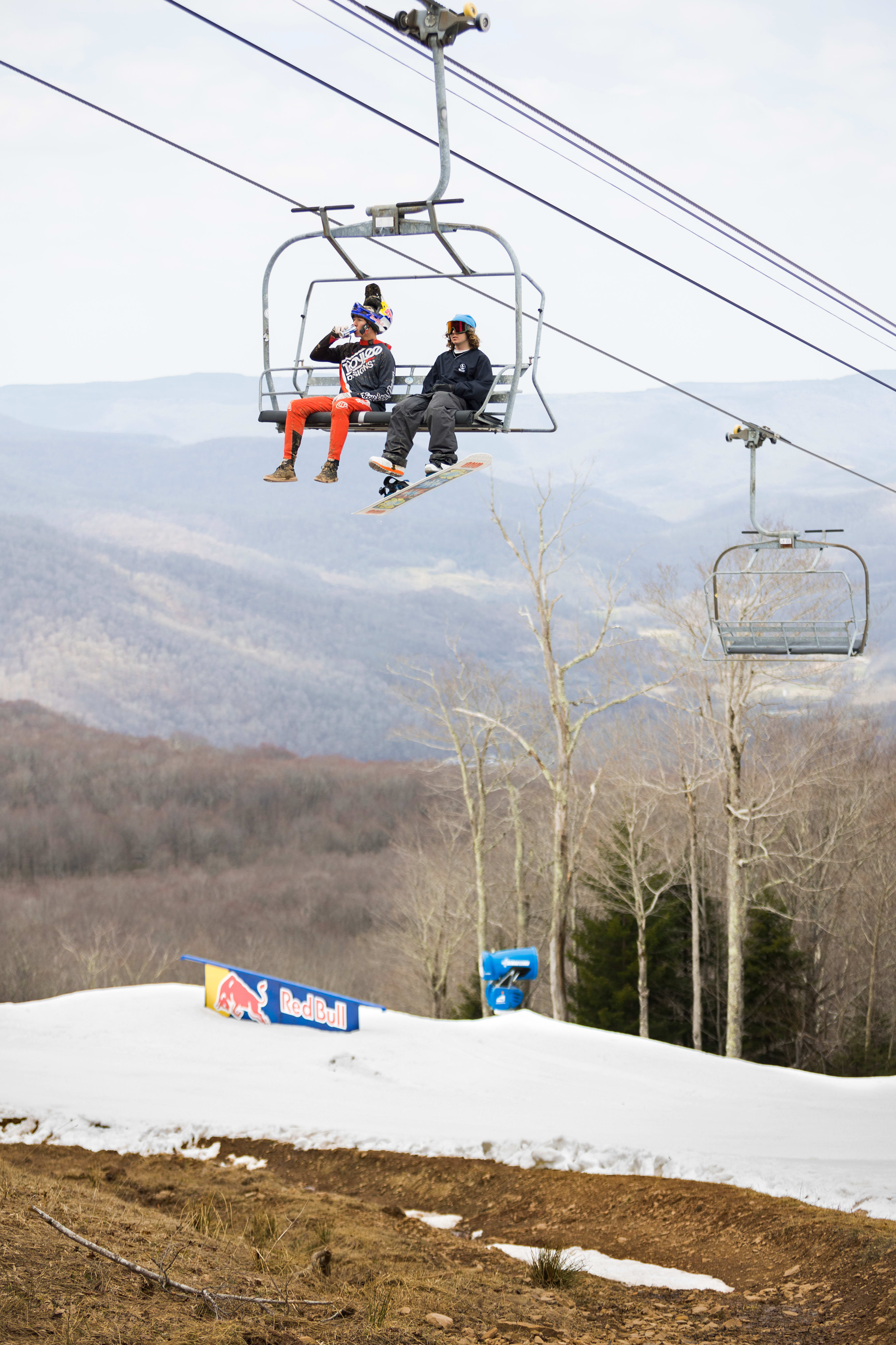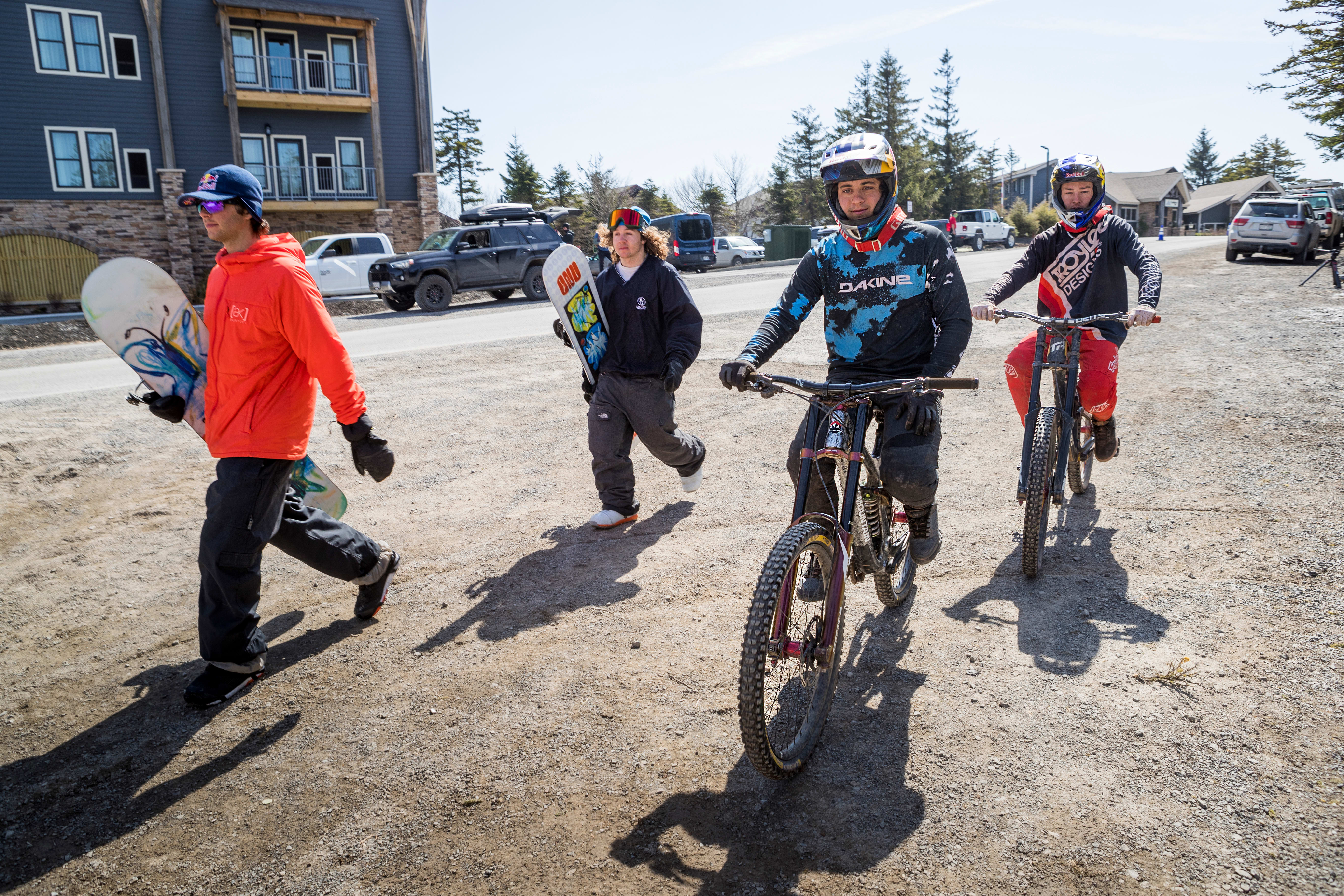 Snowboarders Luke Winkelmann and Sean Fitzsimmons, and mountain bikers Jaxson Riddle and Carson Storch perform in Snowshoe, USA.