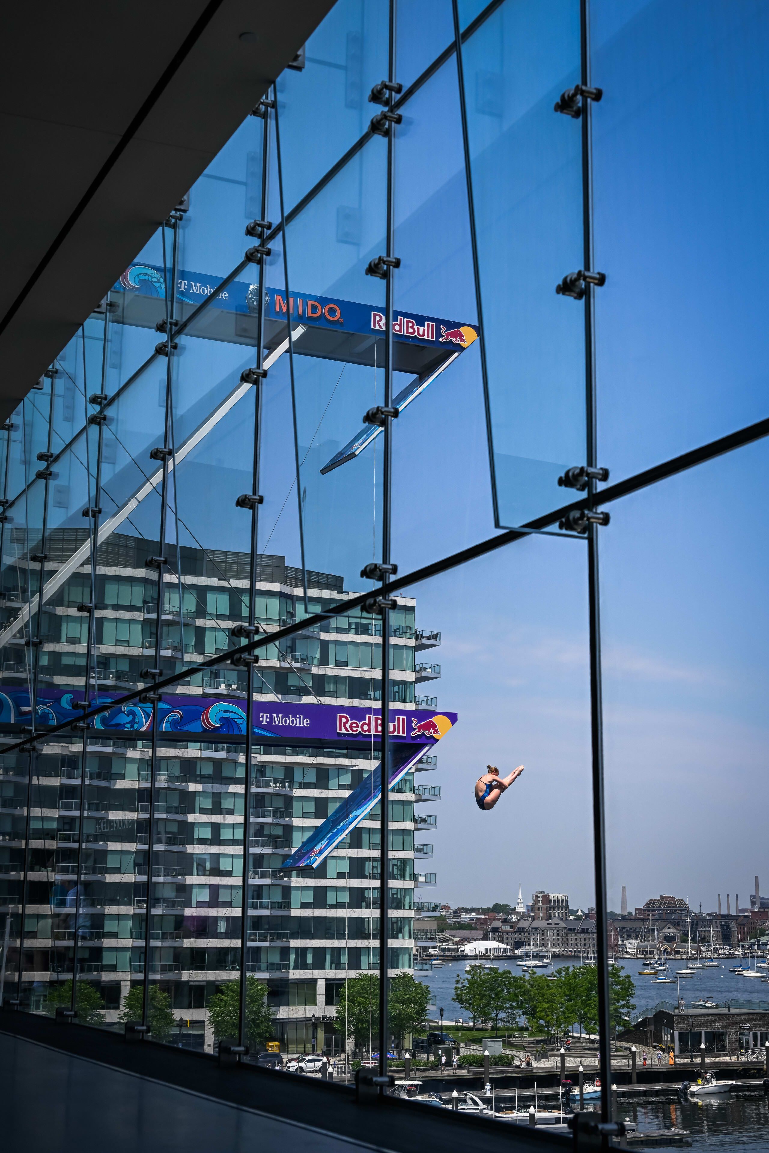 All the Red Bull Cliff Diving Boston diving action takes place from platforms perched above the waterfront Institute of Contemporary Art in the Seaport district, with the women diving from 21m and the men diving from the 27m platform. Nothing new there, right? Well, not quite.