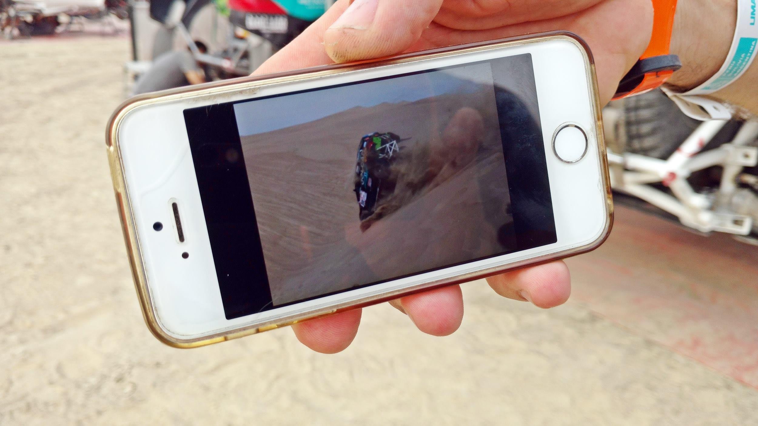 En la primera especial de la carrera tuvo el primer llamado de atención cuando casi vuelca al bajar por una duna. “Mira la foto… Fue tremendo”, dice al tiempo que amplia la imagen en su celular.