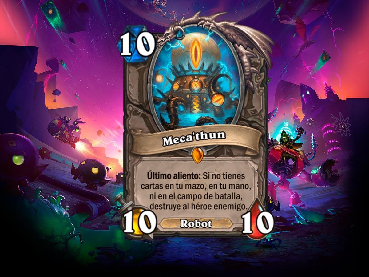 Los puntos de daño están bien y son necesarios, pero a veces no son suficientes para acabar con el rival. La proliferación de escudos en Guerrero y Druida junto con las decenas de formas que tienen de sobrevivir hace que cueste mucho ganar una partida, pero nunca hay que perder la esperanza. Meca’thun es, básicamente, esa esperanza. Un 10 al cubo que cuenta con el Último aliento de ganar la partida. Si fuese Grito de batalla sería todavía más útil, pero no podemos decir nada de una carta que derrota al rival de forma tan sencilla.