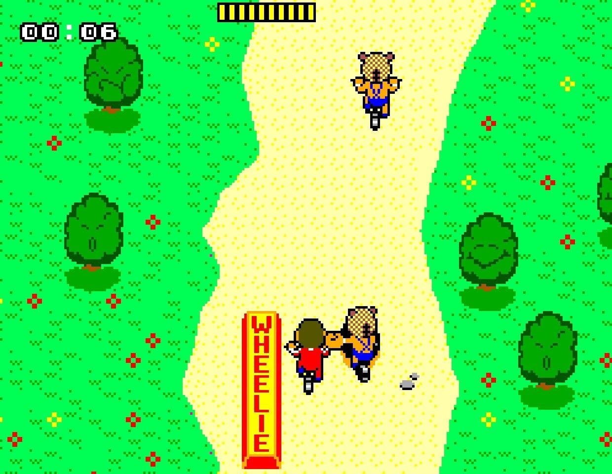 Bien, esto es un poco exagerado, pero aprovecharemos cualquier oportunidad para meter a Alex Kidd en una lista, no importa lo vergonzoso que sea. Alex Kidd era la mascota de Sega mucho antes de que Sonic apareciera en escena, con un total de seis juegos a su nombre. Uno de ellos era Alex Kidd BMX Trial, un estrafalario juego de carreras en el que nuestro héroe de orejas grandes tenía que abrirse camino a través de una serie de pistas de obstáculos sobre su bicicleta BMX. Sin embargo, no era tan simple como eso, porque Alex también era perseguido por riders rivales que trataban de tirarlo de su bici. Si lograban que se estrellara un cierto número de veces, no podía continuar y el juego terminaba.