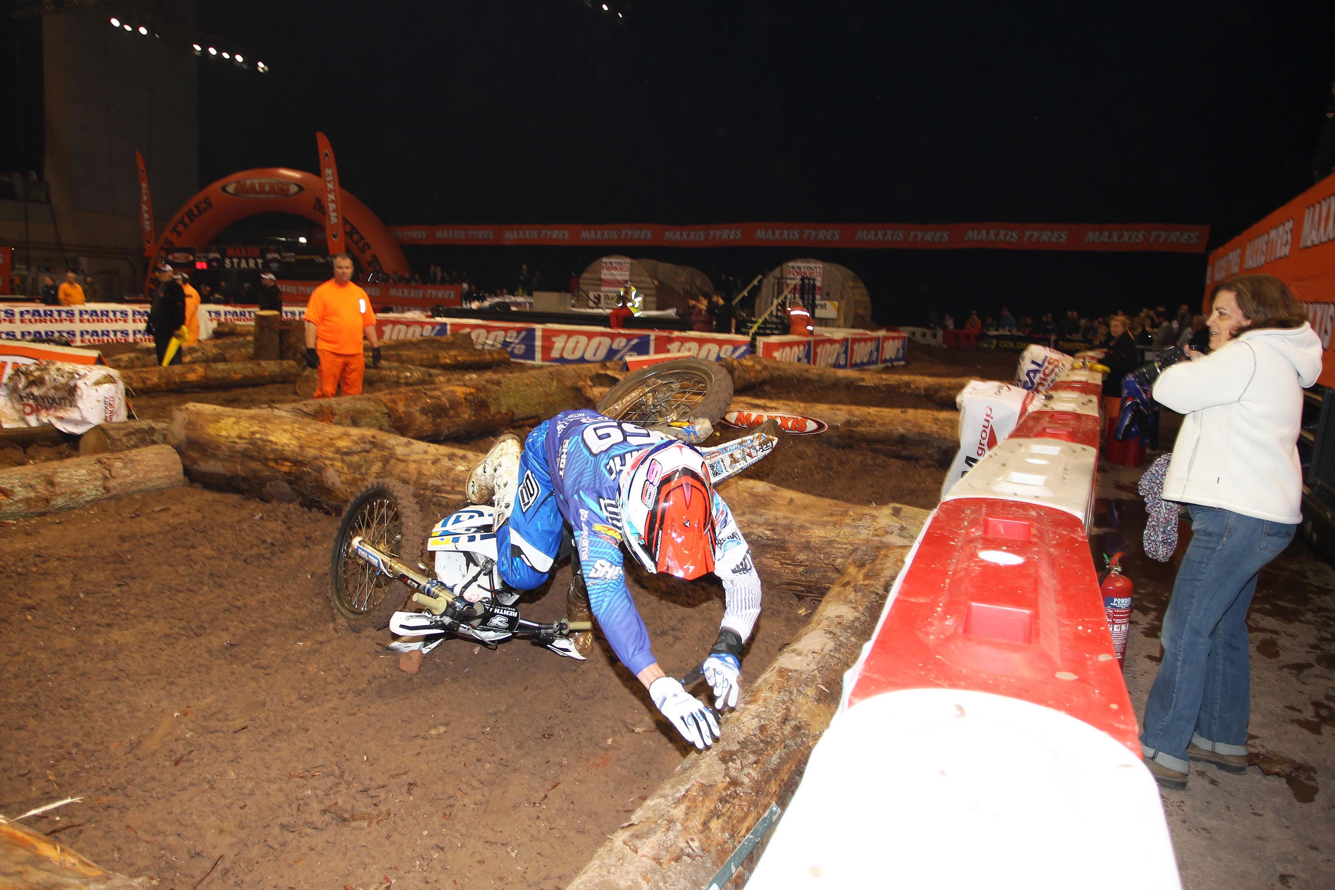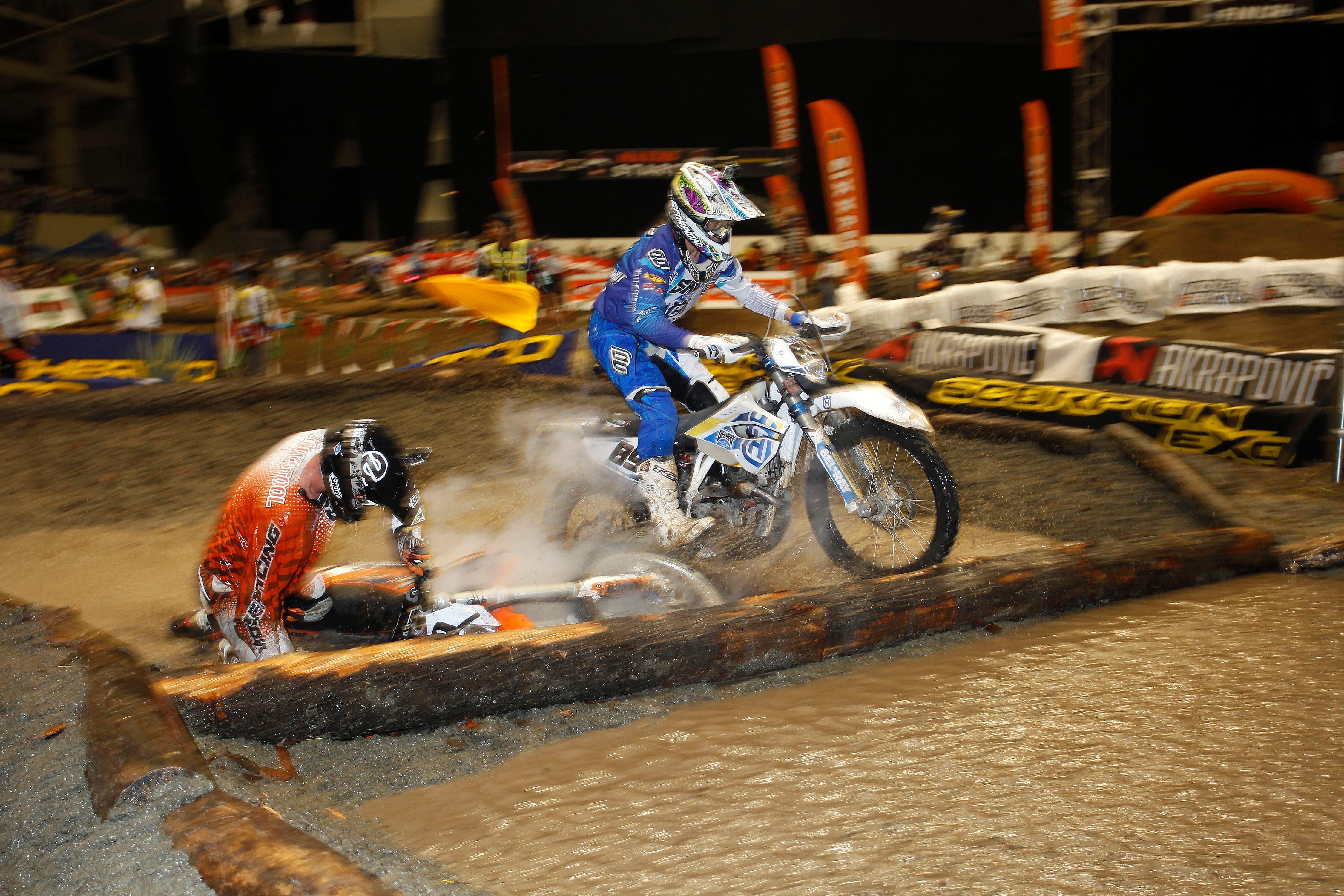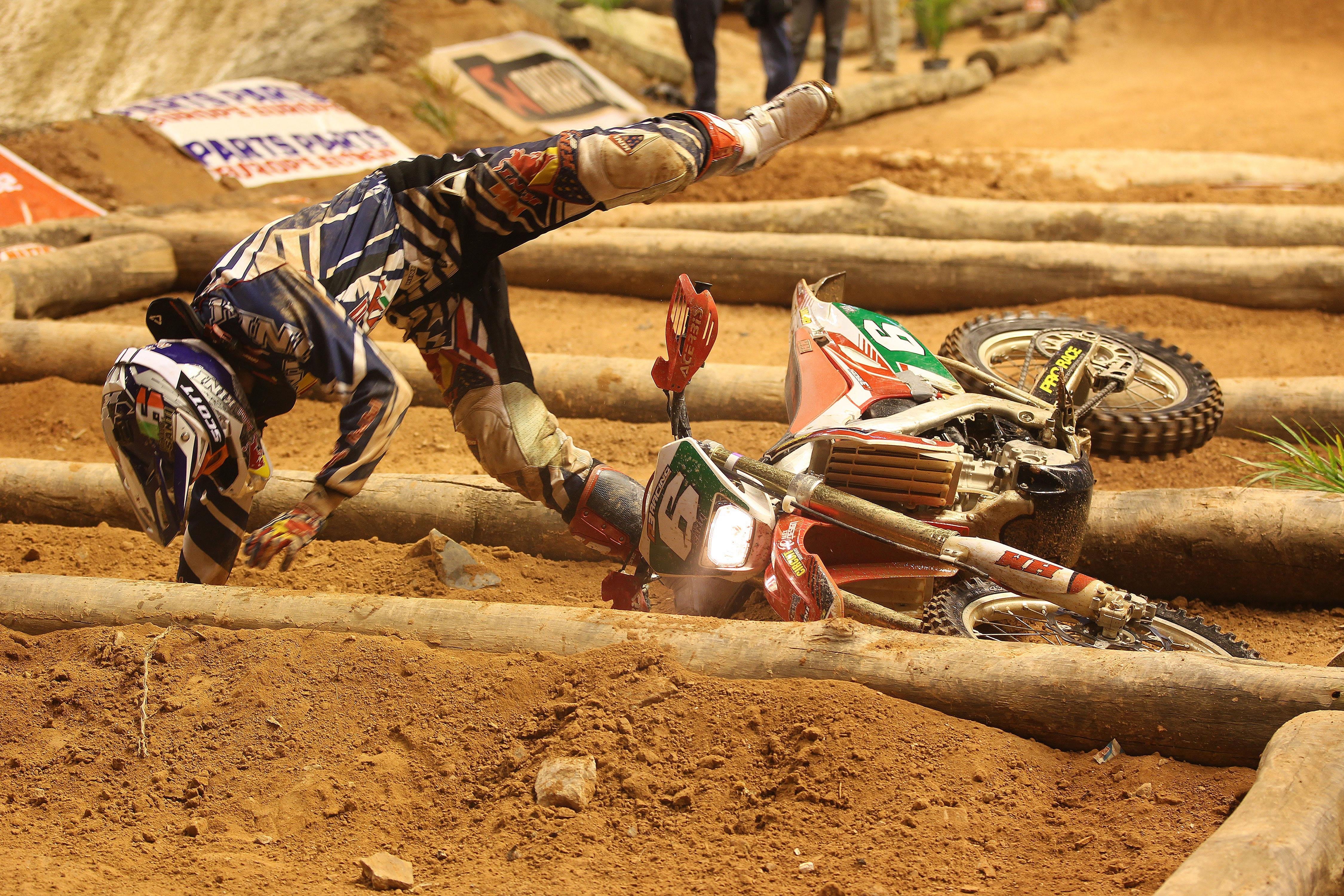 Wenn man die 16 weltbesten SuperEnduro-Rider auf eine in eine Arena gepresste Rennstrecke loslässt, sind Unfälle unausweichlich. Jeder will den anderen von seinem Platz drängen, niemand will auch nur einen Millimeter verschenken, also kommt es regelmäßig zu harten Gefechten.