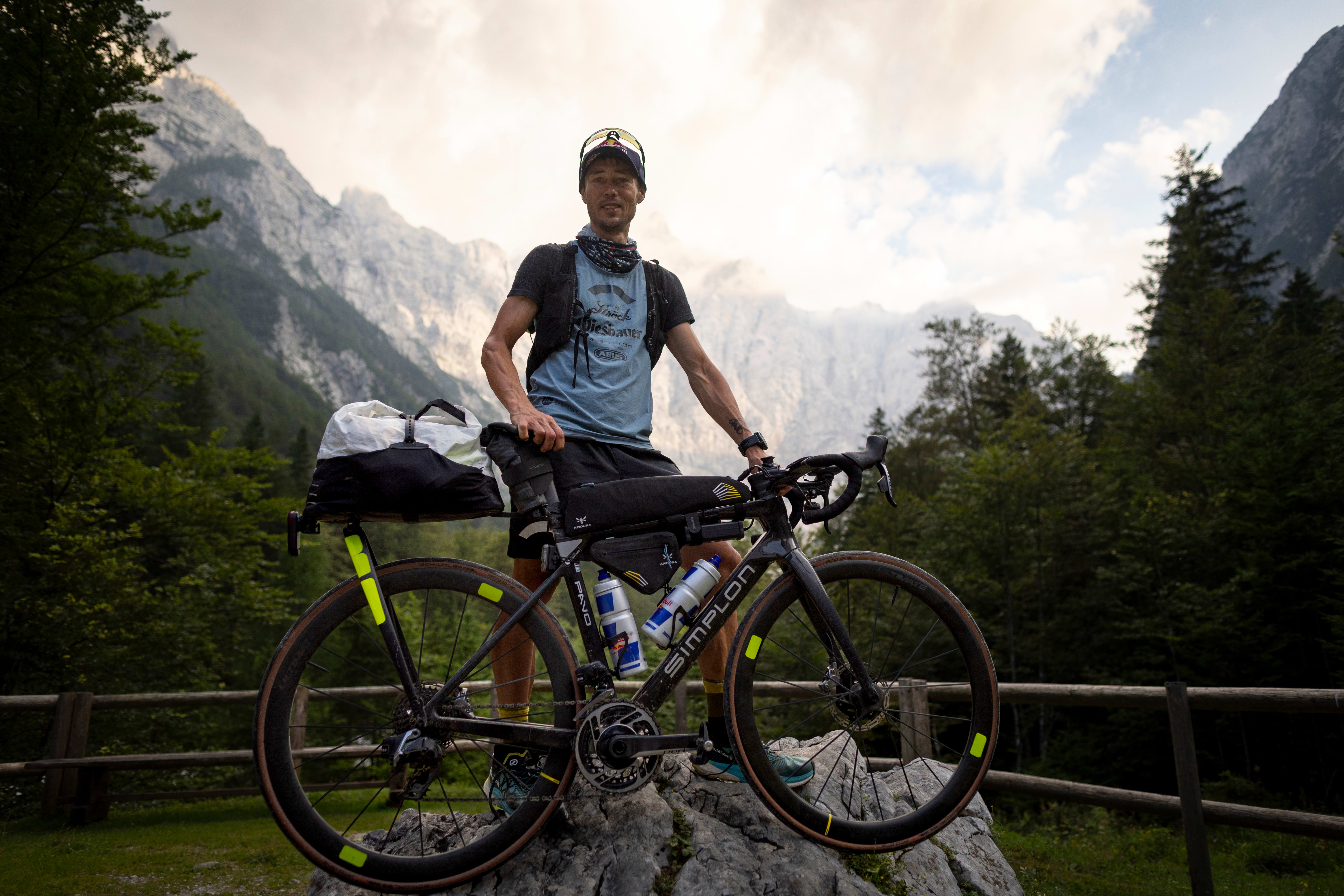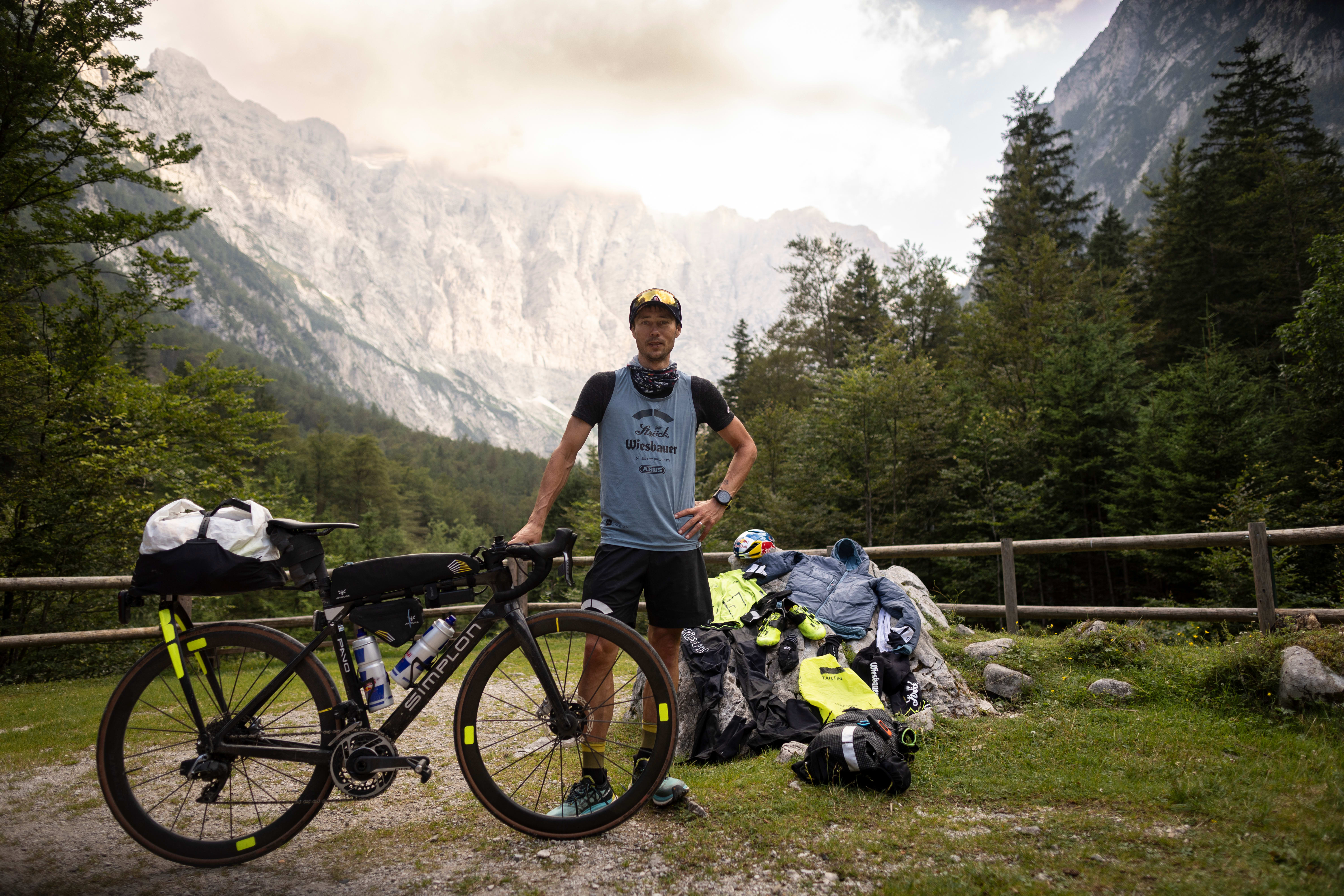 "Solo unsupported" heißt das Zauberwort: Das bedeutet, dass Michael Strasser keine motorisierte Hilfe und keine fremde Unterstützung in Anspruch nehmen durfte. Im Klartext: kein Begleitauto, keine Bergpartner und kein Support vom Streckenrand. Noch nicht mal ein Anfeuern von Freunden und der Familie war erlaubt – denn bereits dies würde als mentale Unterstützung gelten. Er transportierte seine gesamte Bergausrüstung inklusive Pickel, Steigeisen und Schuhe eigenständig auf seinem umgebauten Simplon PAVO IV. Das hochmoderne Allround-Bike hatte selbst nur 6,5 Kilogramm, dazu kam noch das Gepäck: Mit einem beladenen Gesamtgewicht von über 20 kg jagte er über Passstraßen mit tausenden Höhenmetern. "Ich musste mir jedes Essen, jedes Getränk und jeden Schlafplatz selbst organisieren", erklärt Michael Strasser. "Und ich durfte nur Infrastruktur verwenden, die öffentlich zugänglich ist."