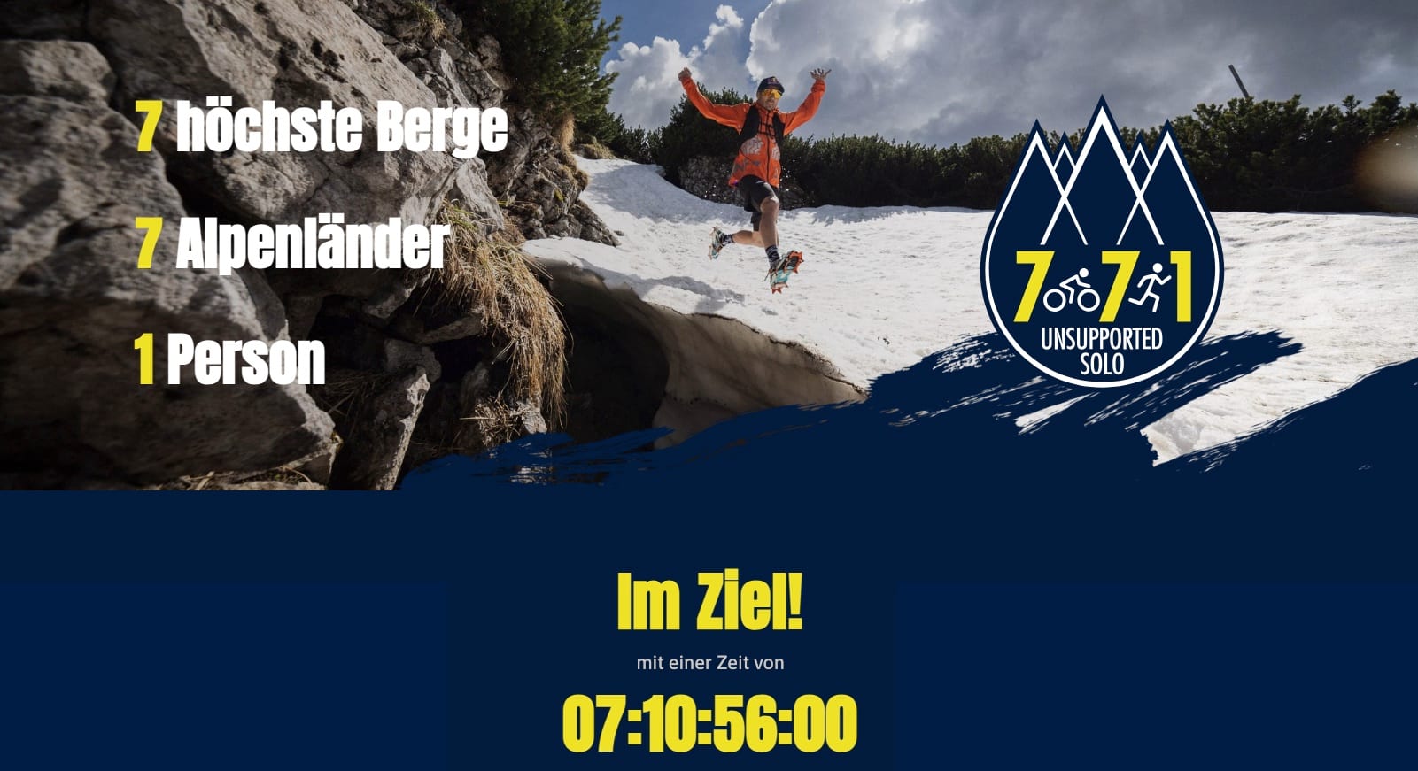 Michael Strasser did it again! Bereits zum dritten Mal holte sich Michael Strasser einen Weltrekord. Mit seinem Projekt 771 – Seven Seven One Solo Run bewältigte der österreichische Extremsportler non-stop und ohne fremde Hilfe oder Begleitfahrzeug die 7 höchsten Berge der 7 Alpenländer – vom Mont Blanc in Frankreich bis zum Triglav in Slowenien. Nach dem Start am 2. Juli 2024 um 04:22 Uhr morgen am Fuß de Mont Blanc erreichte er sensationell nach nur 7 Tagen, 10 Stunden und 56 Minuten sein Ziel in Slowenien, am Fuße des Triglav, nachdem er ihn als letzten der 7 Berge bezwungen hatte. Es ist die "Fastest Known Time" für diese Challenge, eine Zeit für die Rekord- und Geschichtsbücher.