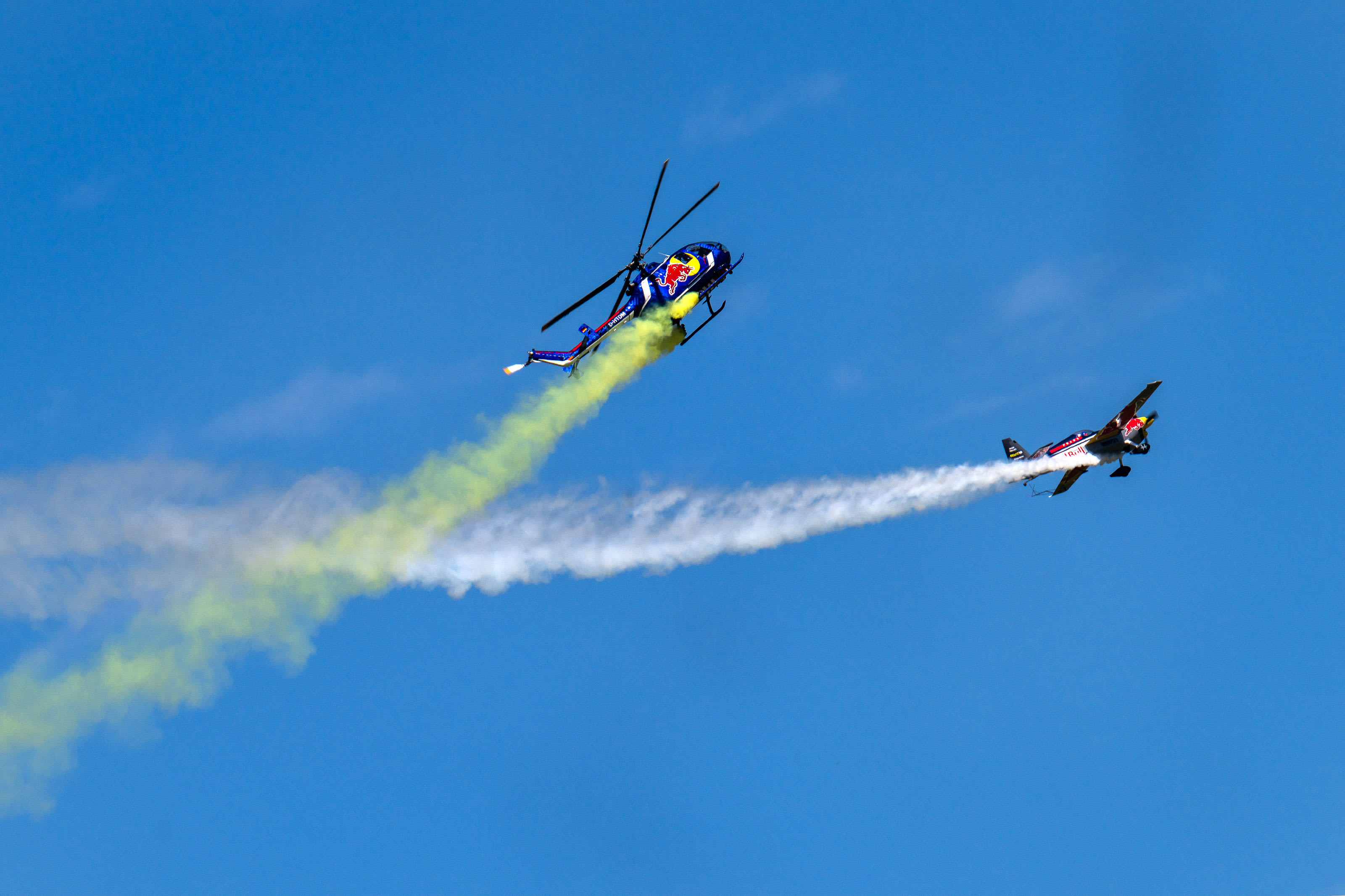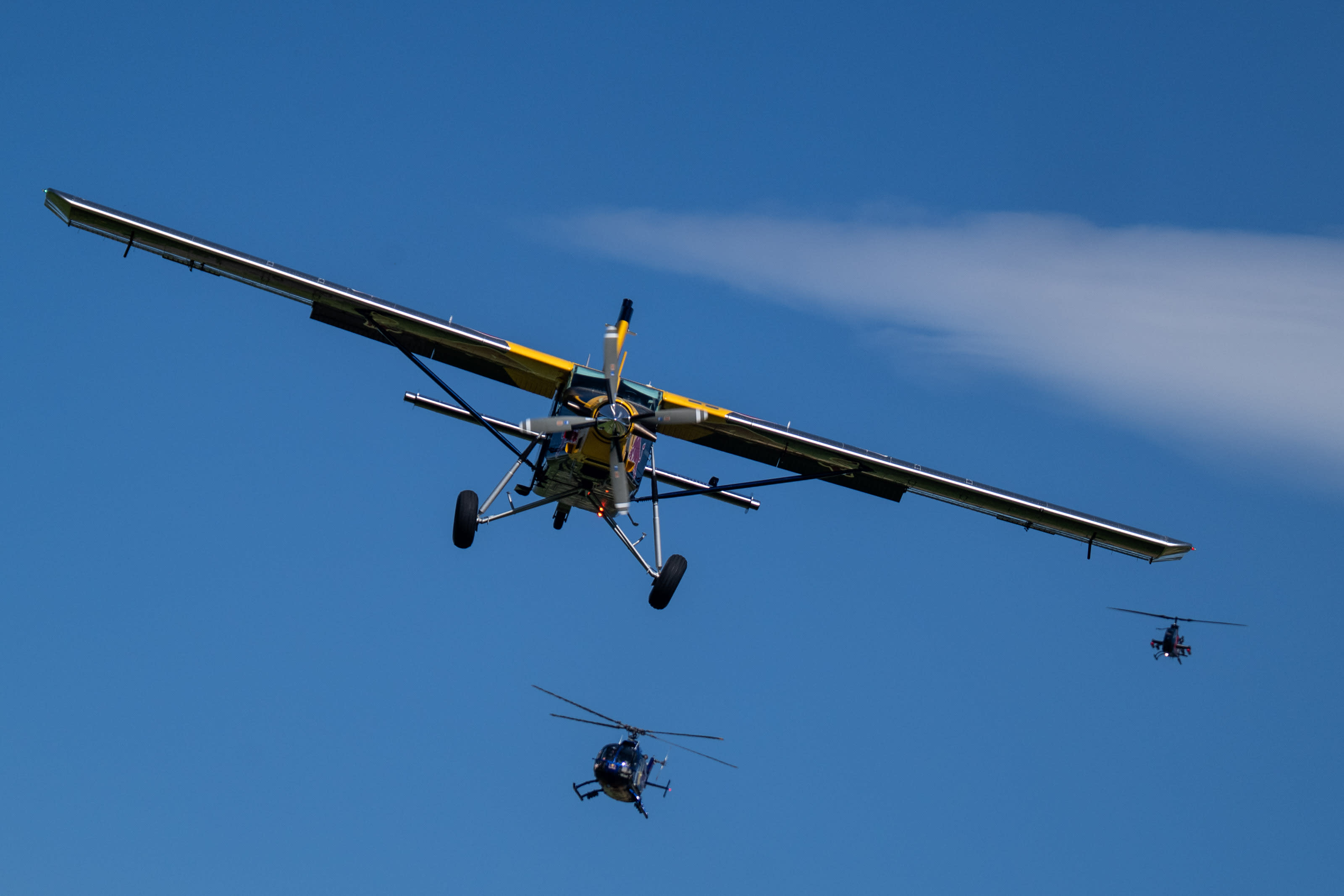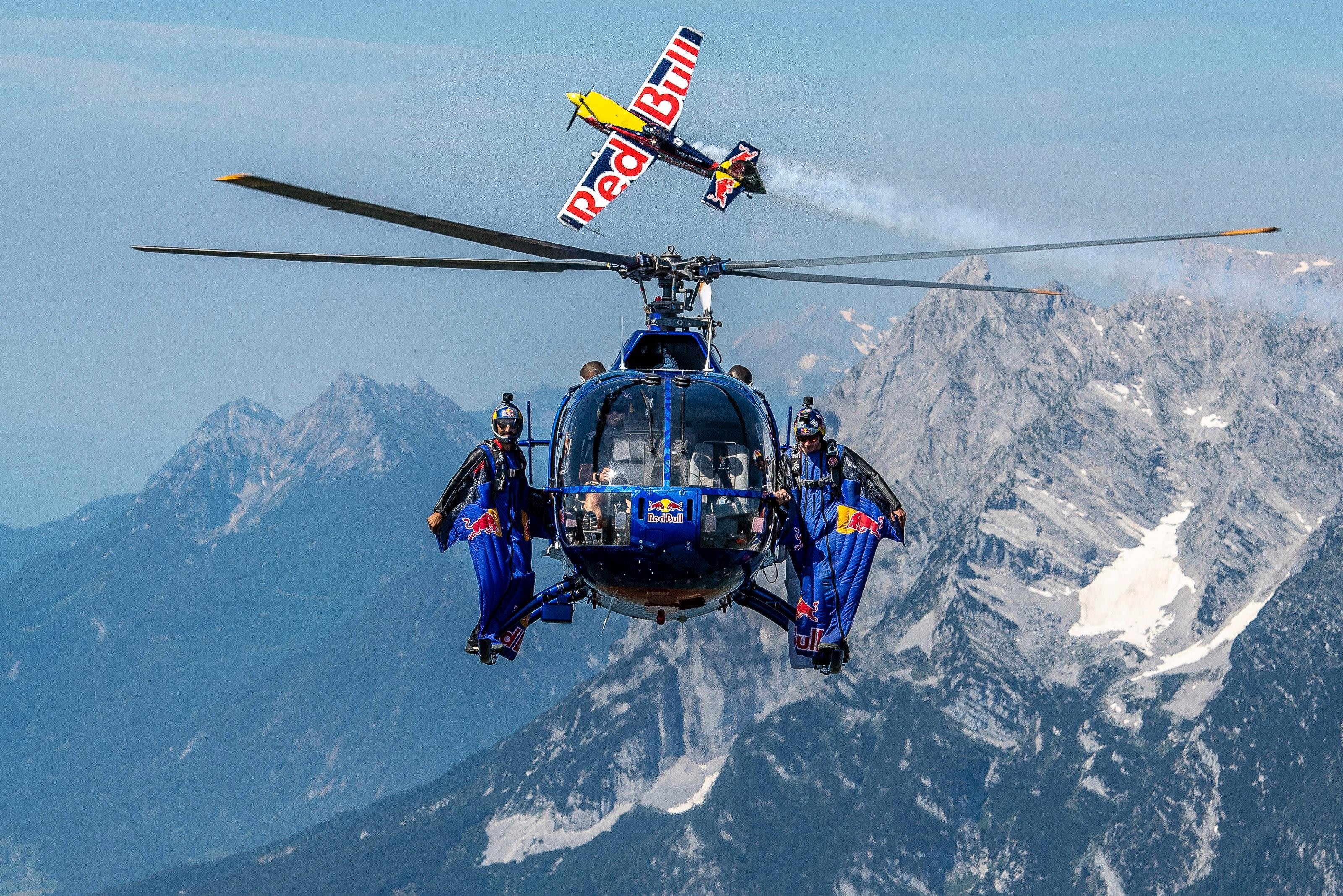 Auch für Airshow-Profis wird das Red Bull Aerobatic Triple ein echter Gänsehaut-Moment. Denn erstmals treffen Flugzeuge und Hubschrauber der Flying Bulls, die Wingsuit-Jumper des Red Bull Skydive Teams und die Fallschirmspringer des HSV Salzburg in einem exakt choreografierten Zusammenspiel aufeinander. Dabei sind sowohl der einzige Kunstflug-taugliche Hubschrauber der Welt, die BO-105, die Bell „Cobra“ 209/AH-1F – der legendäre Hubschrauber der amerikanischen Streitkräfte der 1960er-Jahre – als auch die historische PT-17 Stearman und die Zivko Edge 540.