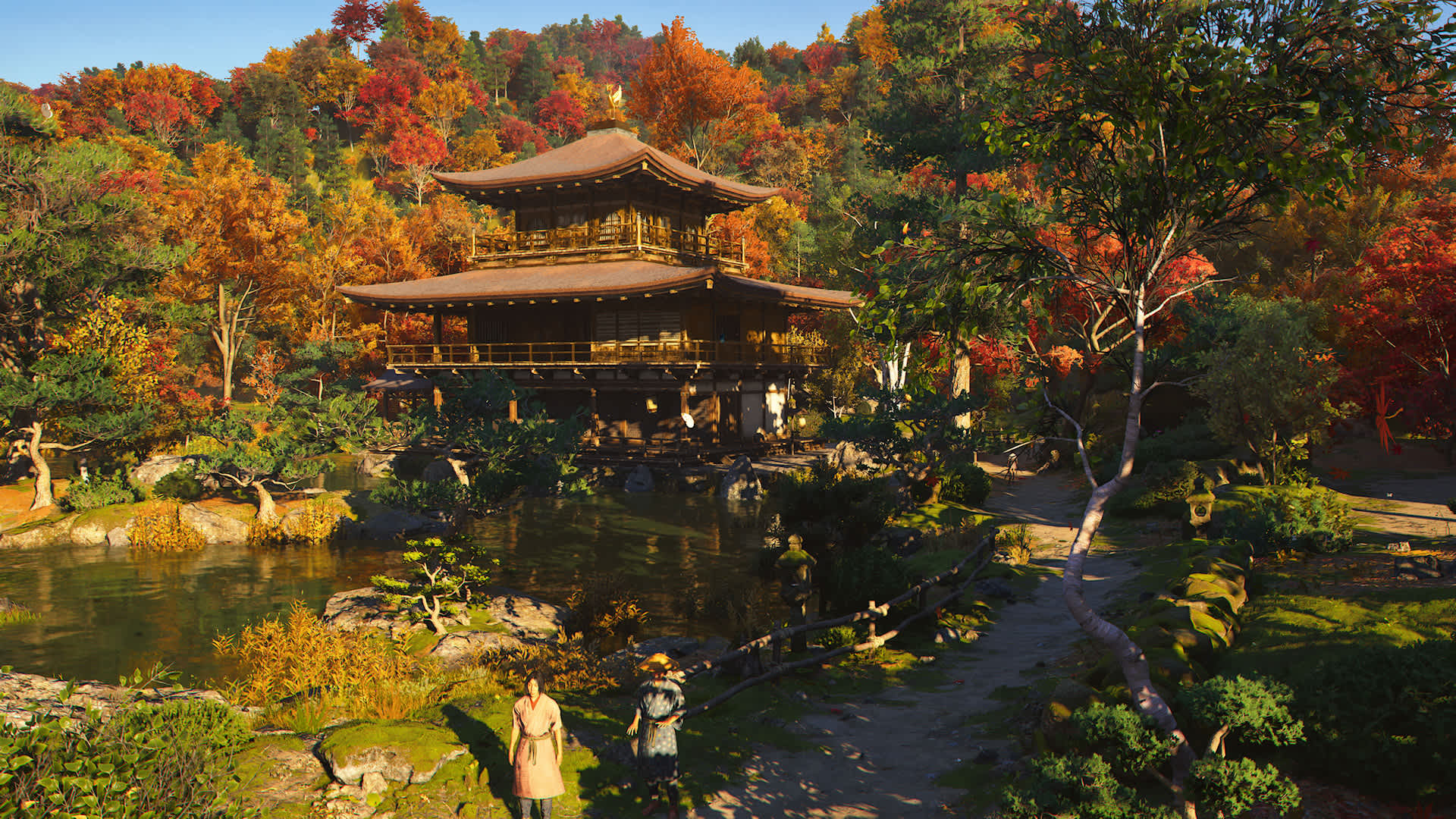 Das Gegenstück zum silbernen Tempel findet man in Form des goldenen Tempels - Kinkaku-ji, im Nordwesten von Kyoto. Sowohl in der realen Welt, als auch im Spiel ist hier der Name Programm. Im Zentrum der Anlage findet ihr den namensgebenden Pavilion, der mit Blattgold überzogen ist. Während damals die Bezeichnung des Kinkaku-ji sich lediglich auf dieses Gebäude bezog, wird mittlerweile die gesamte Anlage mit diesem Namen bezeichnet.