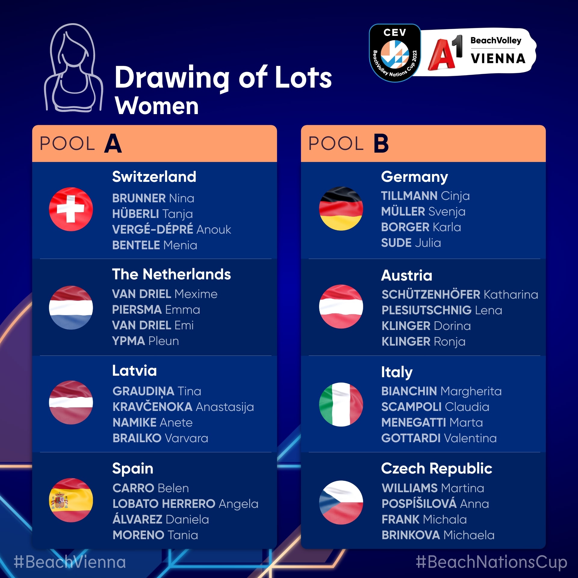 Bereits die Gruppen des A1 CEV BeachVolley Nations Cup Vienna 2022 haben es erwartungsgemäß in sich: Bei den Damen setzt sich Pool A aus der Schweiz, den Niederlanden, Lettland und Spanien zusammen. Österreichs Teams wurden in Pool B zu Deutschland, Italien und Tschechien gelost. Den Auftakt bestreiten sie in der Night Session am Dienstag gegen die Italienerinnen.