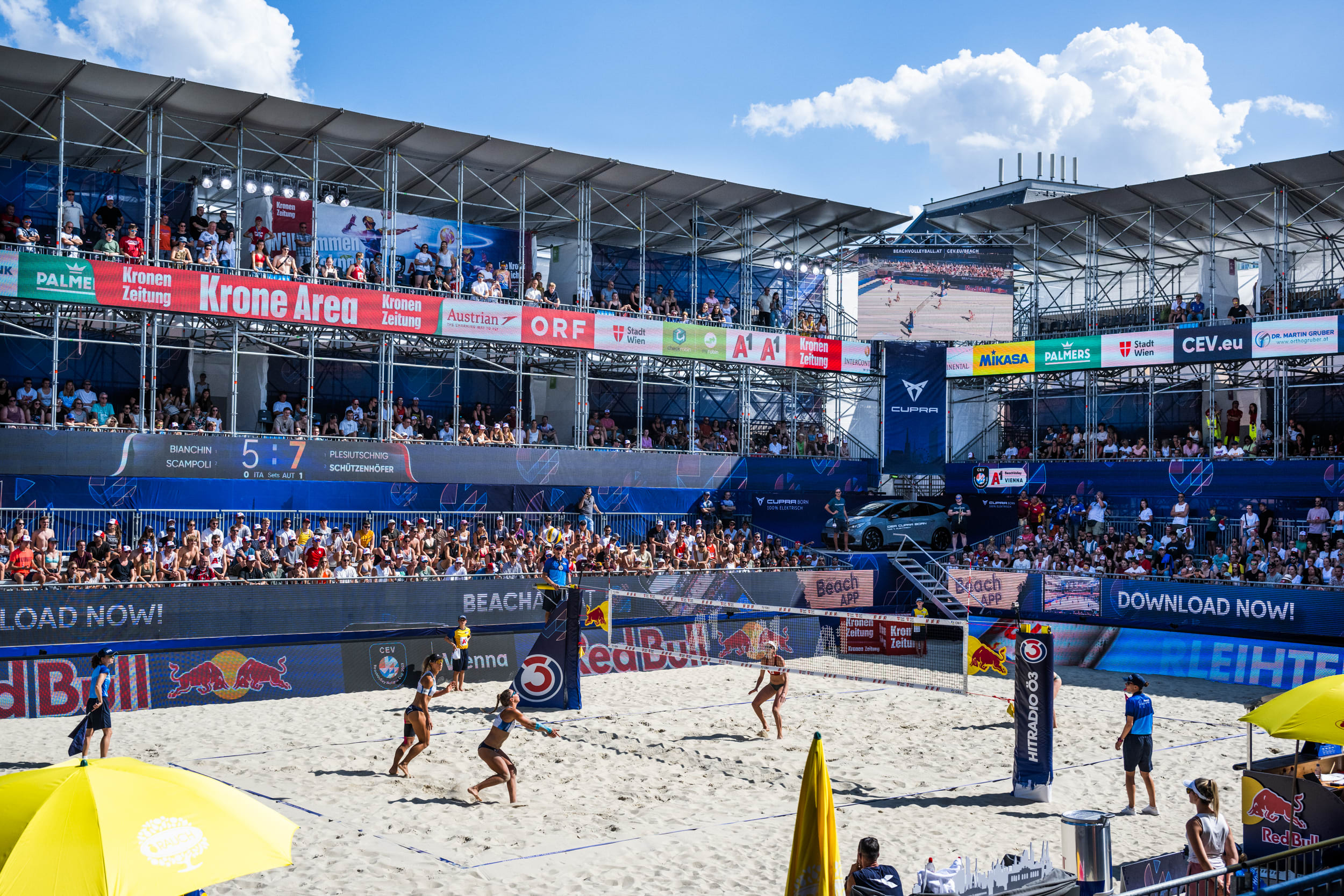 Nations-Cup-Premiere, top Wetter, tolle Stimmung: Es war ein toller Start in eine spannende Beachvolleyball-Woche. Bis 7. August kämpften die besten Beachvolleyballer:innen um den ersten Nations-Cup-Titel für ihr Land. Am ersten Tag waren die Damen-Teams an der Reihe: Die Österreicherin verloren ihr Länder-Duell gegen Italien unglücklich mit 1:2, den Golden Set verloren Katharina Schützenhöfer/Lena Plesiutschnig gegen Reka Orsi Toth/Sara Breidenbach mit 13:15 Punkten.