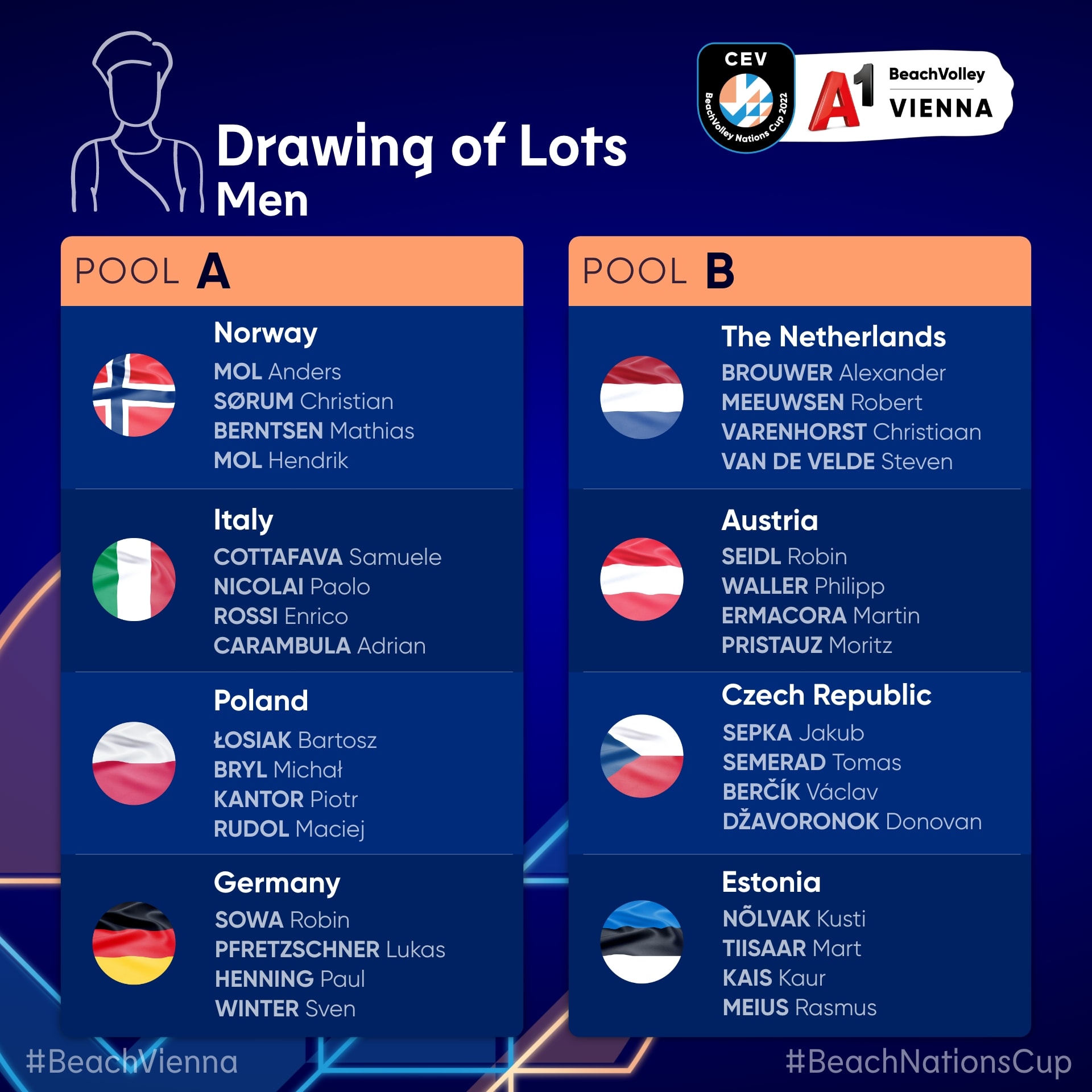 Bei den Herren trifft in Pool A Norwegen mit den Olympiasiegern, Welt- und Europameistern Mol/Sörum auf Italien, Polen und Deutschland. Österreich bekommt es in Pool B am Mittwoch in der Night Session zunächst mit Tschechien zu tun, das andere Duell bestreiten die Niederlande und Estland.