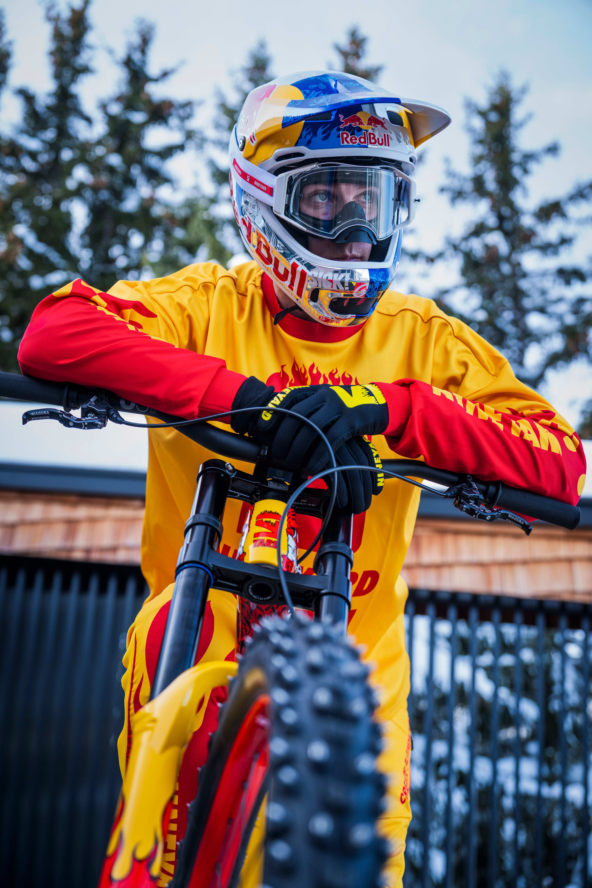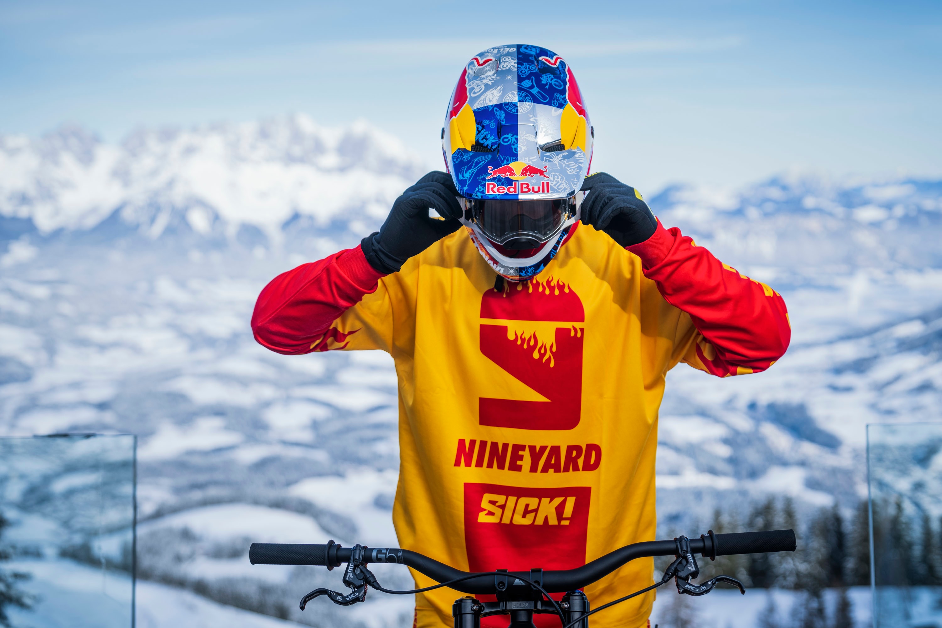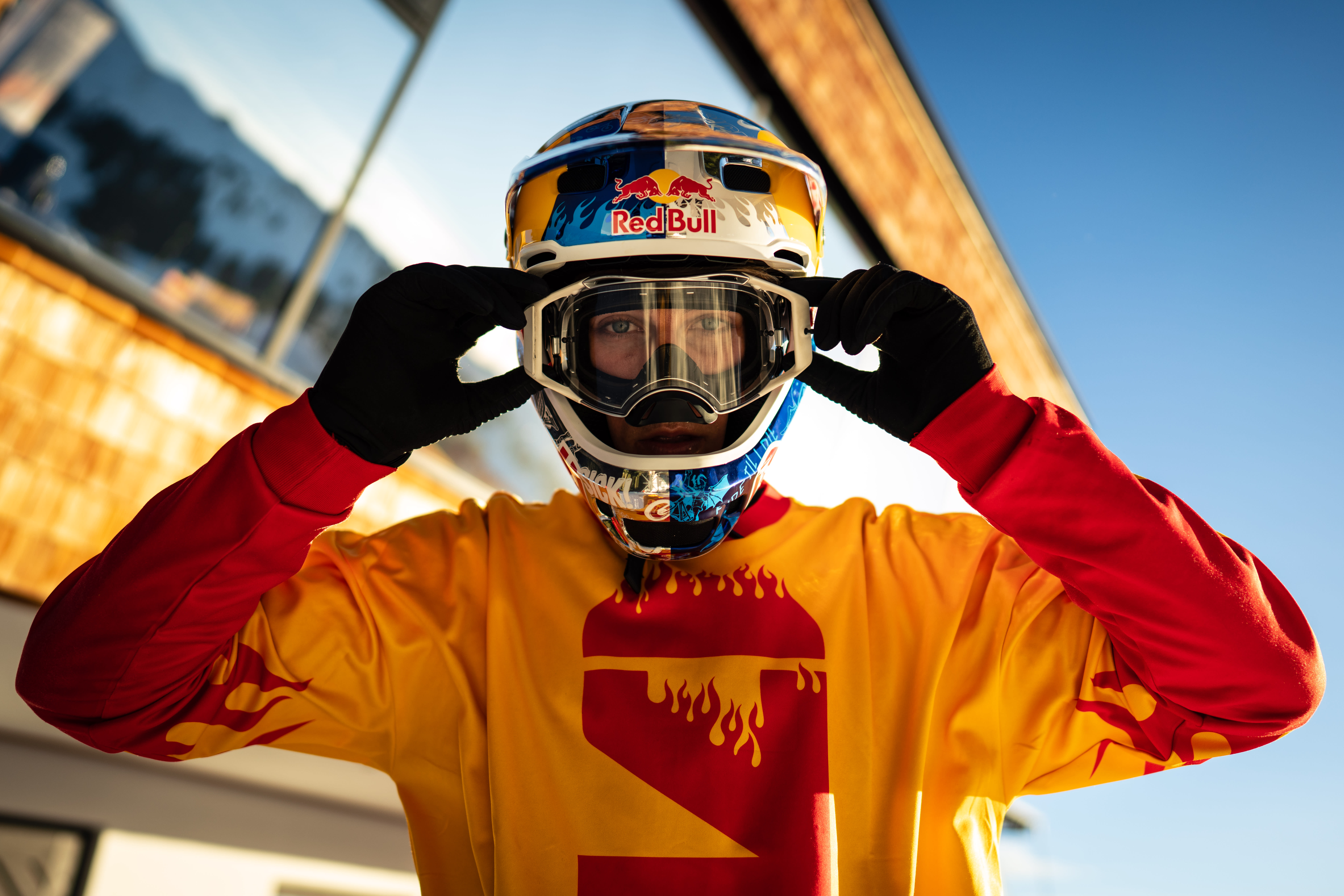 Starthang, Mausefalle, Steilhang, Hausbergkante und Zielsprung: Die Streif verlangt den Skistars von der ersten Sekunde alles ab. Dies gilt auch für Bike-Pro Fabio Wibmer. Um seinen crazy MTB-Ideen Flügel zu verleihen, lässt er nicht nur sein Talent aufblitzen und zieht spektakuläre Skills aus dem Ärmel – und das mit Style. Das Spezial-Outfit seiner eigenen Marke Nineyard, angepasst an den Firecracker-Style seines Canyon Bikes und der Custom-Design-Helm mit Chrom-Applikationen sind echte Eyecatcher. Darauf darf natürlich der schon legendäre "Geleck"-Schriftzug nicht fehlen.