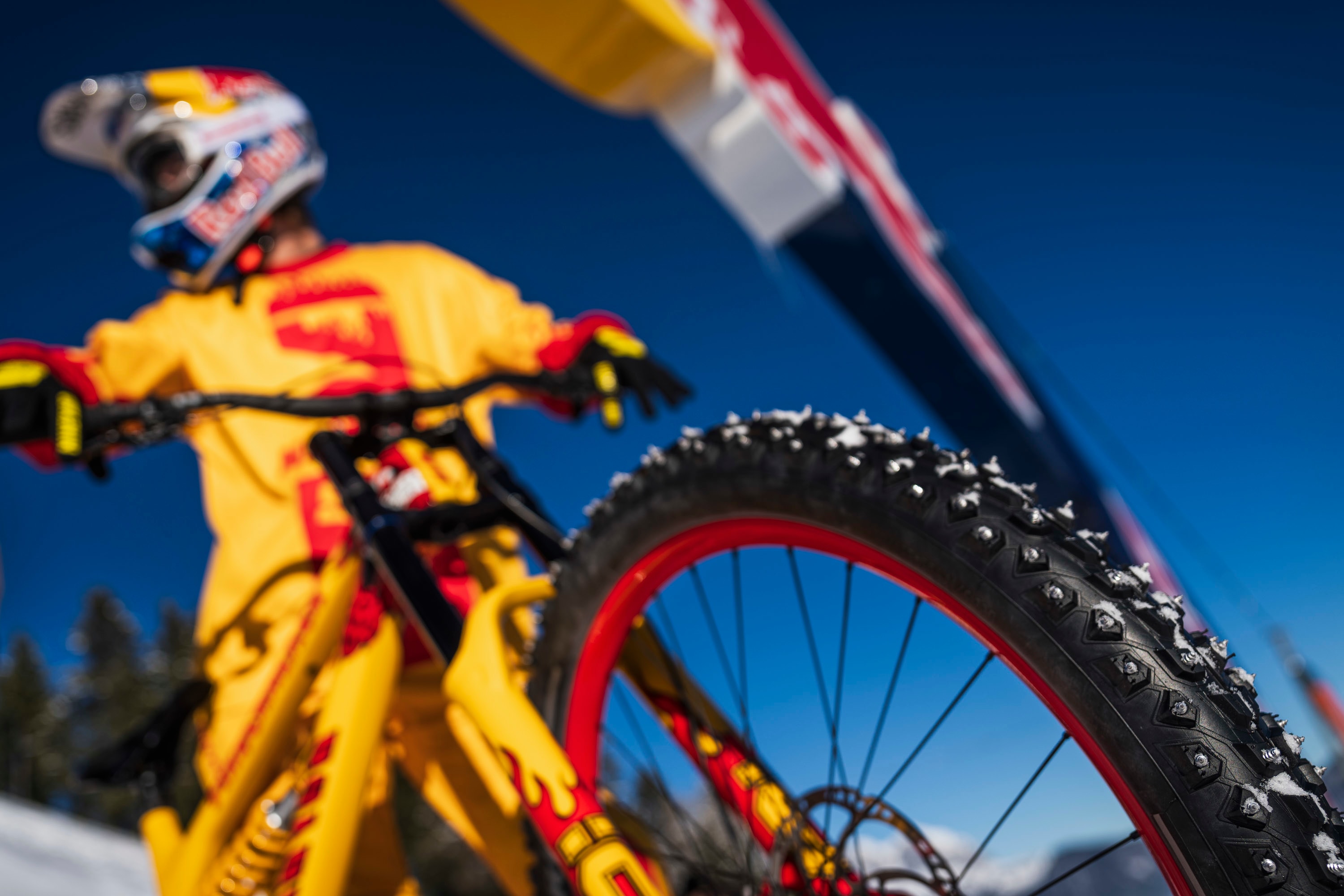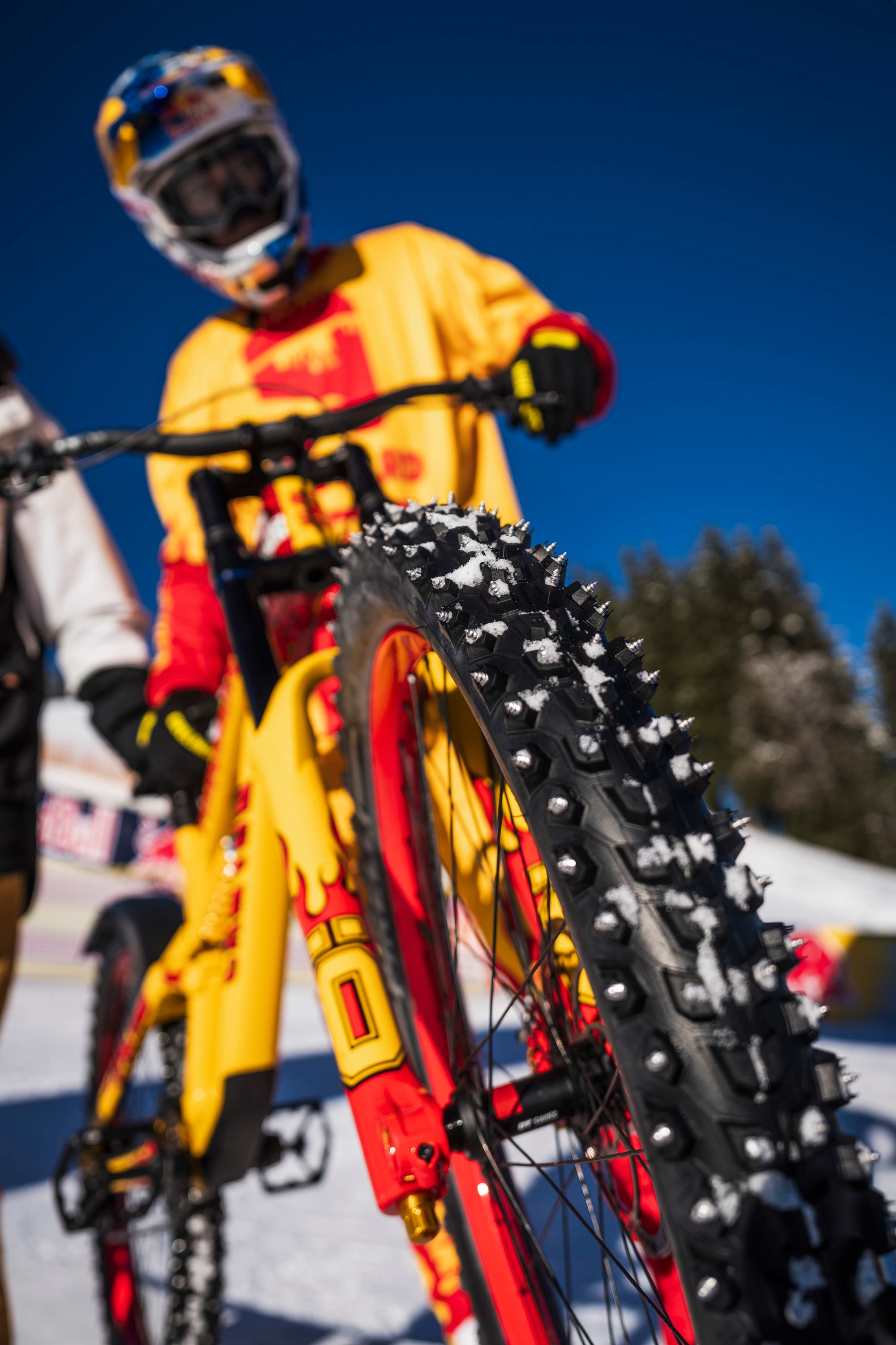 Der Mountainbike-Pro hat sich intensiv auf dieses Projekt vorbereitet, denn neben Physis, mentaler Stärke und viel Erfahrung spielt auch das perfekte Material eine entscheidende Rolle. Ein "Herzstück" des Bike-Setups sind sicherlich die Spikes. 288 Stück pro Reifen in unterschiedlichen Längen wurden verbaut – natürlich keine Ware von der Stange, sondern individuell angefertigt. Und klar: Die Spikes müssen perfekt sein – darum betraute Fabio Wibmer einen echten Profi mit dieser Spezialaufgabe.