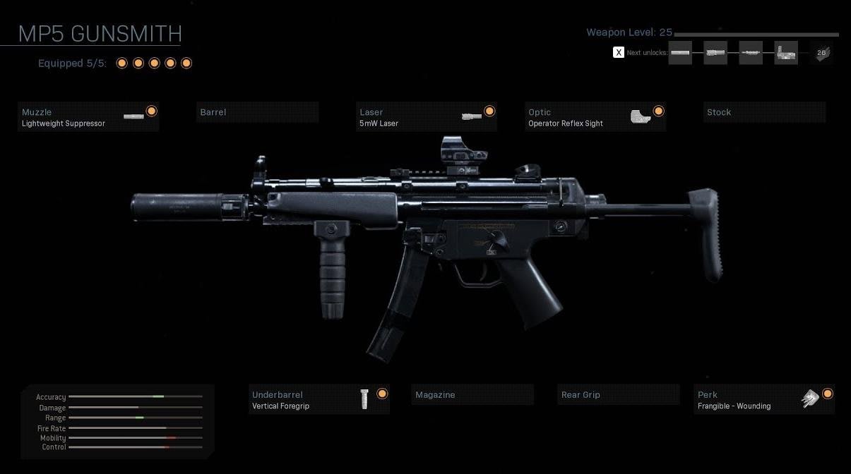MP5 (Maschinenpistole): Die vielleicht beste Waffe für kurze und mittlere Entfernungen. Die MP5 überzeugt mit hoher Präzision und ist selbst bei Dauerfeuer noch gut kontrollierbar.