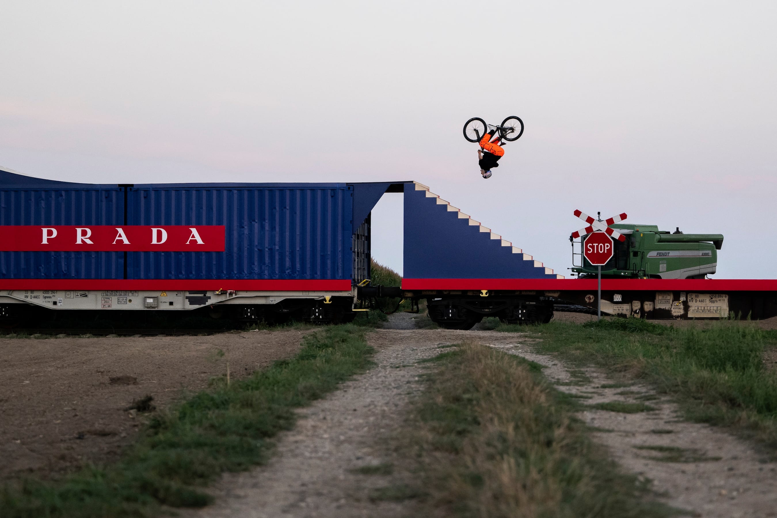 Im Ernst: Dieser Trick schwebte mir schon lange vor. Niemand hatte ihn bisher auf einem Mountainbike gemacht, also wollte ich ihn ausprobieren. Ich begann ein paar Tage vor den Aufnahmen mit den Vorbereitungen. Es stellte sich heraus, dass es schwieriger war, als ich ursprünglich angenommen hatte. Als ich den Zug in natura sah, bemerkte ich, dass die Treppe höher war, als ich dachte. Natürlich kannte ich die Maße vorher, aber du weißt ja, wie es ist, wenn du die Hindernisse live siehst. Der Schlag bei der Landung auf der Ebene war so stark, dass alle meine Gelenke hart getroffen wurden. Aber ich wollte einen Trick machen, den noch niemand zuvor gelandet hatte, um dem Projekt mehr Würze zu geben.