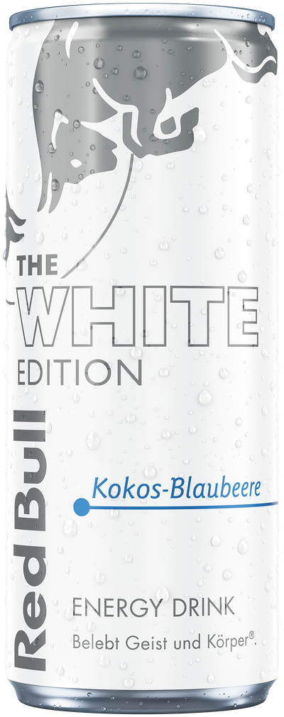 Die Red Bull White Edition mit dem Geschmack von Kokosnuss und fruchtiger Blaubeere.
