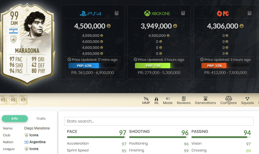 Die erste Ikone in unserem FUT 20 Dreamteam! Die Moments-Karte von Diego Maradona ist kaum zu stoppen. Einzelwerte wie 99 Dribbling, 97 Tempo und 96 Schießen machen ihn zu einer absoluten Waffe im Angriff und führen zu einem Overall-Rating von 99.