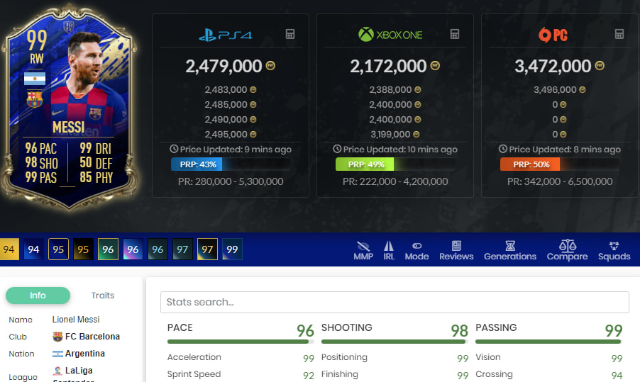 Im besten FUT-Squad darf natürlich auch der mittlerweile sechsmalige Weltfußballer Lionel Messi nicht fehlen. Seine Team of the Year-Version glänzt mit 99 Dribbling, 99 Passen, 98 Schießen und – na klar - einem Overall-Rating von 99.