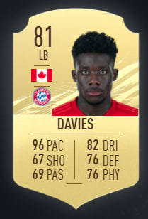 Der Durchstarter des deutschen Rekordmeisters spielt sich in FIFA 21 absolut top. Seine größte Stärke ist das hohe Tempo (96). Aber auch das Dribbling (82) und die Physis (76) sind solide. Wenn ihr einen Linksverteidiger aus der Bundesliga sucht, greift bei Davies zu.