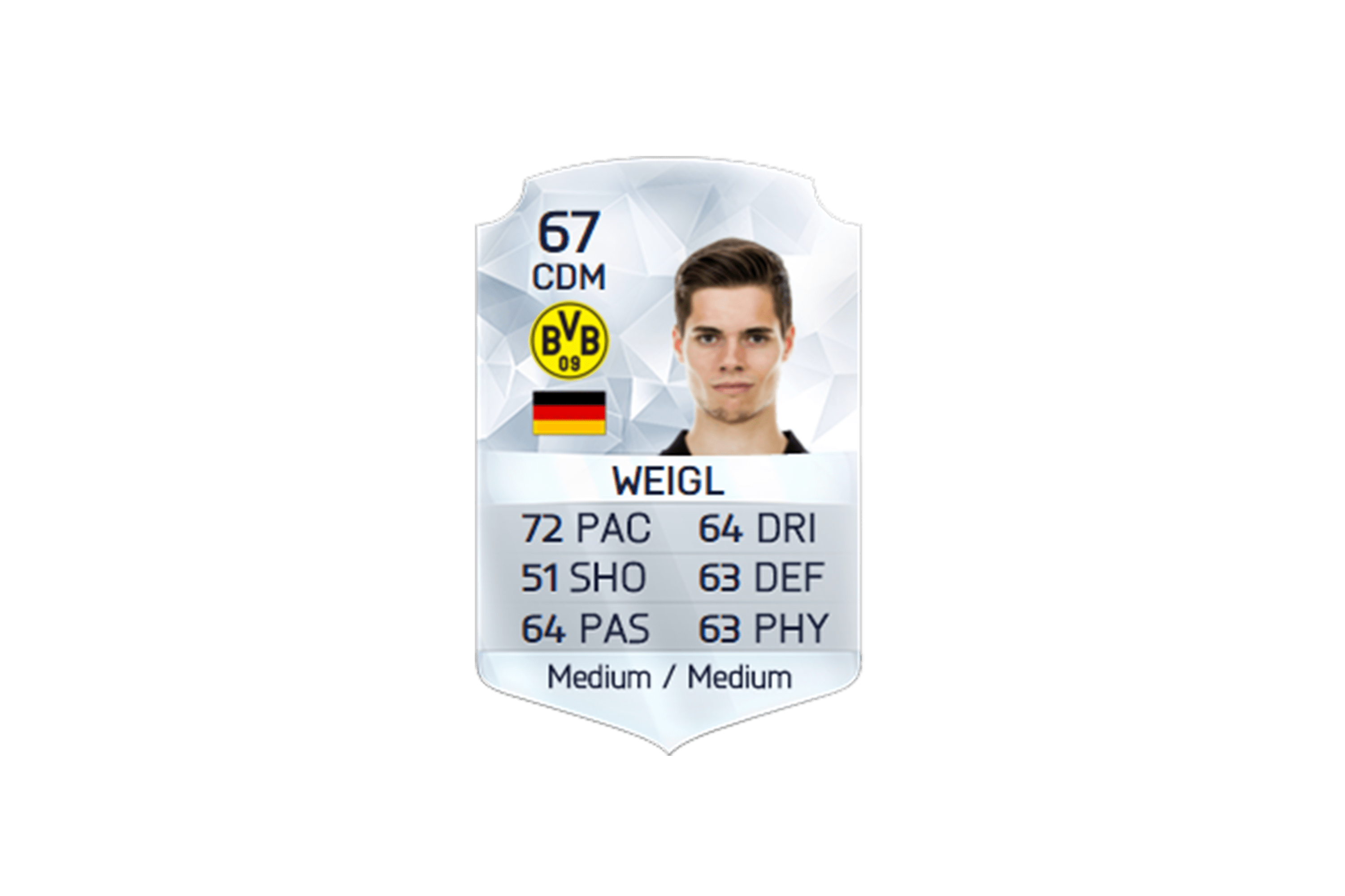 Dass Julian Weigl nach seinem Wechsel zu Borussia Dortmund auf Anhieb Stammspieler wird, war nicht unbedingt zu erwarten. Der 20-jährige Defensivspezialist, der im Sommer 2015 vom Zweitligisten TSV 1860 München zum BVB kam, absolvierte 17 der bisherigen 18 Bundesligaspiele. Nur beim 2:1-Auswärtserfolg beim VfL Wolfsburg musste Weigl krankheitsbedingt pausieren. Seine konstant starken Leistungen für Dortmund blieben auch Manchester City nicht verborgen. Die Engländer wollen Weigl im Sommer zu sich lotsen, haben dem BVB wohl ein Angebot in Höhe von 25 Millionen Euro unterbreitet. Auf dem virtuellen Rasen muss sich Weigl allerdings mit einer Spielerstärke von 67 begnügen.