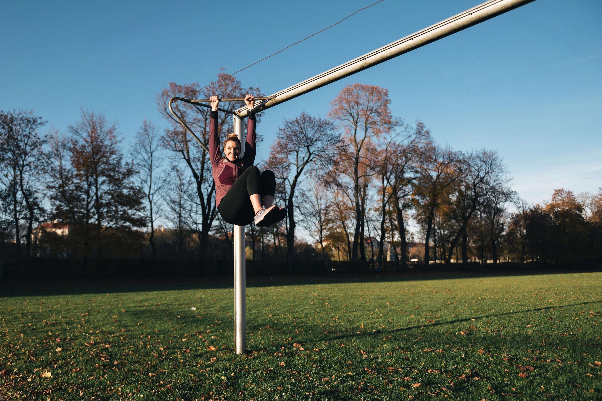 Zeit zum Abhängen! Alleine das Hängen an einer Stange bringt bereits zahlreiche Vorteile für alle Laufsportler, wie Entspannen und Ausrichten der Wirbelsäule, Stabilisierung der Schultern und Stärkung der Arme. Versuche es mal fünf Minuten (auch verteilt über den Tag auf mehrere Sets)! Durch das Anheben der Beine wird die Übung noch intensiver und effektiver, aber auch härter. Sie ist gut für die Bauchmuskeln und den Hüftbeuger.