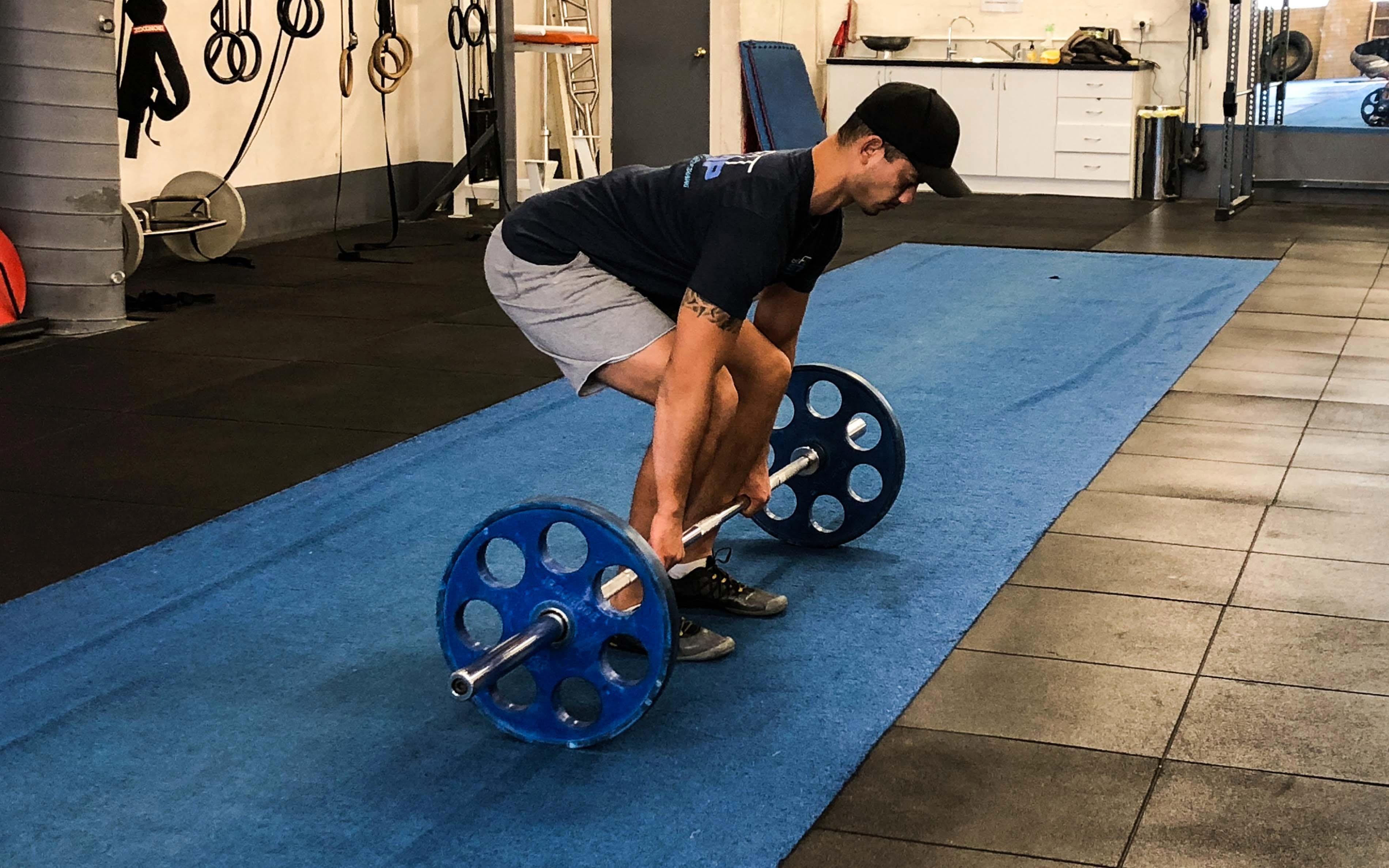 - Wenn du die korrekte Position gefunden hast, sollten deine Vorderarme an der Außenseite deiner Oberschenkel angelegt sein, während deine Schienbeine die Hantel nur leicht berühren sollen.