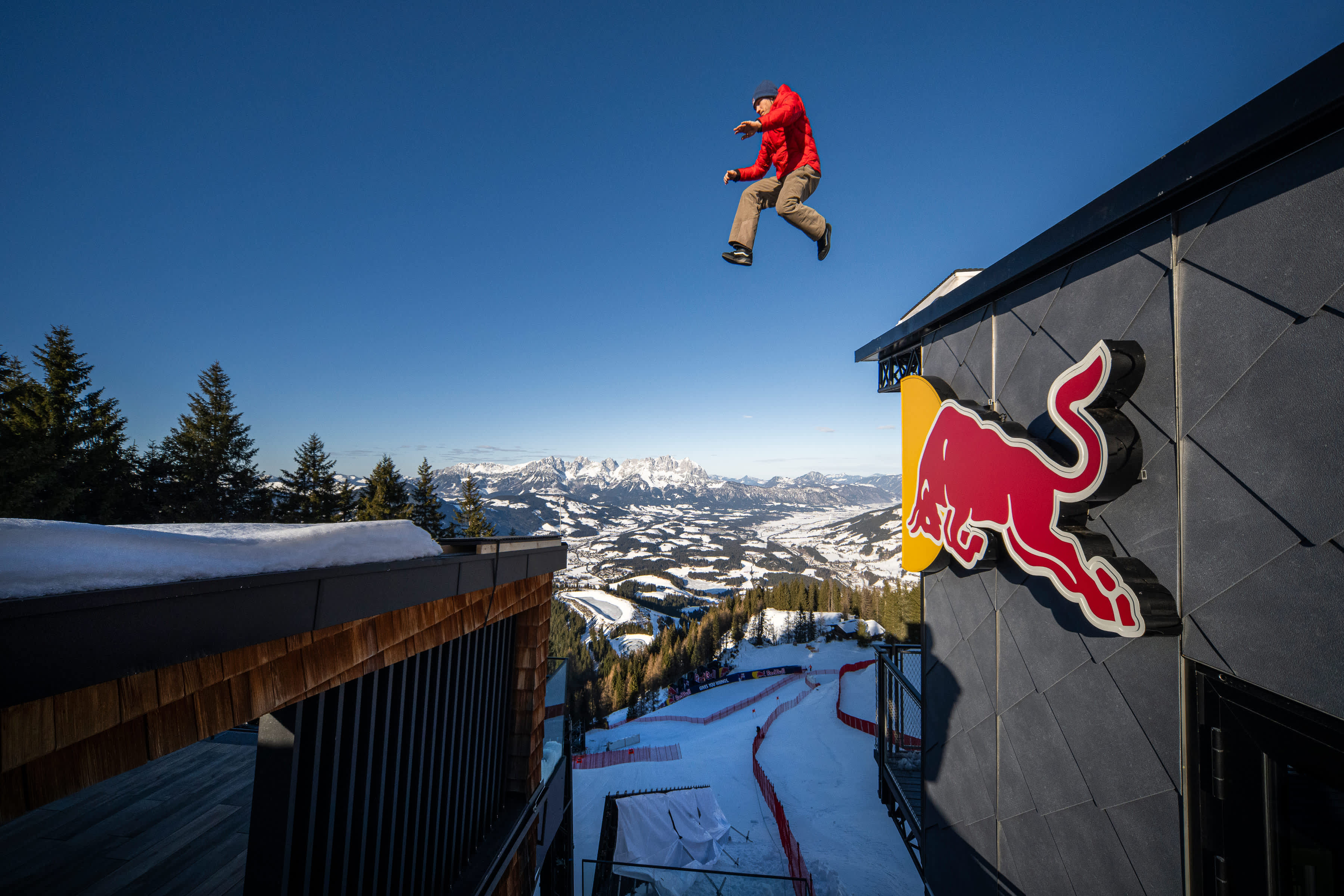 Alpenpanorama statt urbaner Skyline, Sneaker statt Ski, Schnee und Eis statt Asphalt, eisige Skipiste und mobile Tribünen statt starrer Hindernisse aus Beton. Doch eines bleibt gleich: Die Streif verzeiht keine Fehler. Die Initialzündung für dieses Projekt kam genau ein Jahr zuvor, als er die Abfahrt von der Mausefalle aus erlebte. „Die Streif hat ein spezielles Charisma, die Stimmung beim Rennen war außergewöhnlich und hat mich sofort in ihren Bann gezogen“, erinnert sich Jason Paul. „Ich stand damals auf der Tribüne bei der Mausefalle und dachte mir sofort: Das fühlt sich ein bisschen wie ein Parkour-Spot an. Dann schaut man rauf zum Starthaus und sieht dieses Rooftop – in diesem Augenblick startete das Kopfkino. Man kommt ins Nachdenken, ins Reden, und aus einer Vision wird plötzlich Realität.“