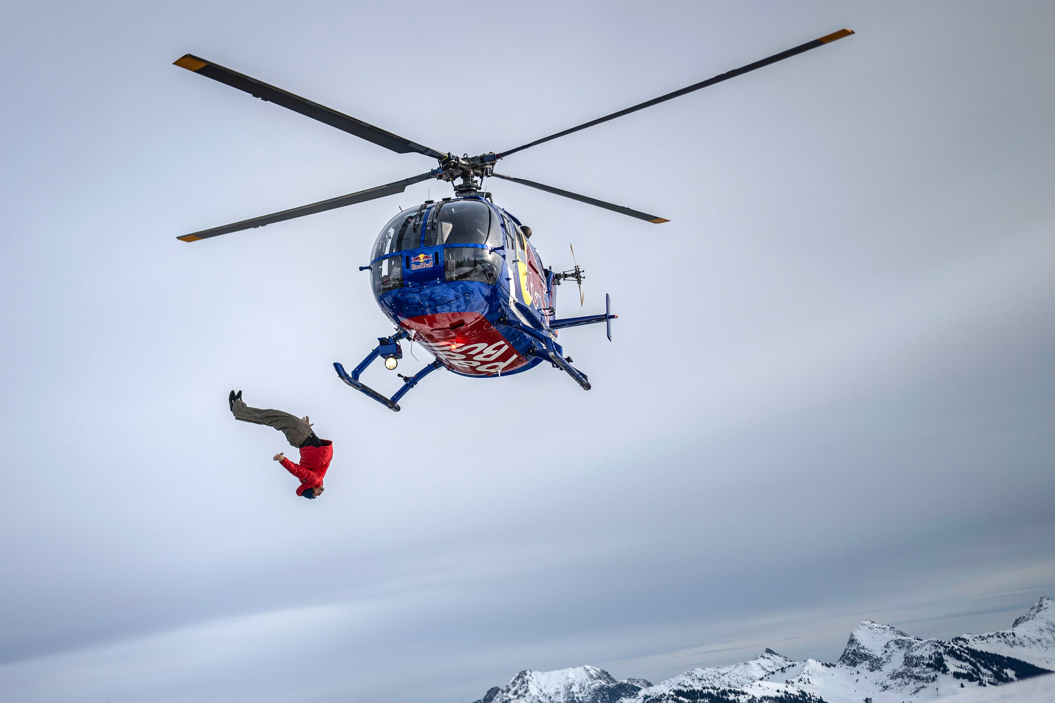 Aber das alleine wäre ja noch zu easy going – darum hat er noch zwei besonderen Ideen aus dem Hut gezaubert. Warum "nur" aus dem Starthaus herausstarten – wenn man Flying-Bulls-Piloten Mirko Flaim anrufen kann, der einem mit dem Hubschrauber BO 105 Flügel verleiht und einen actionfilmreifen "up in the air" Einstieg über dem Starthaus ermöglicht.