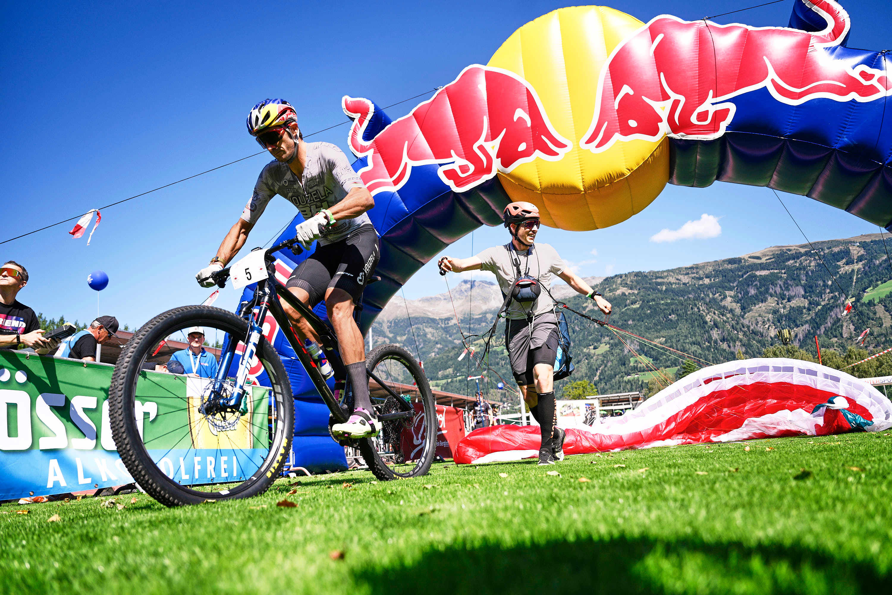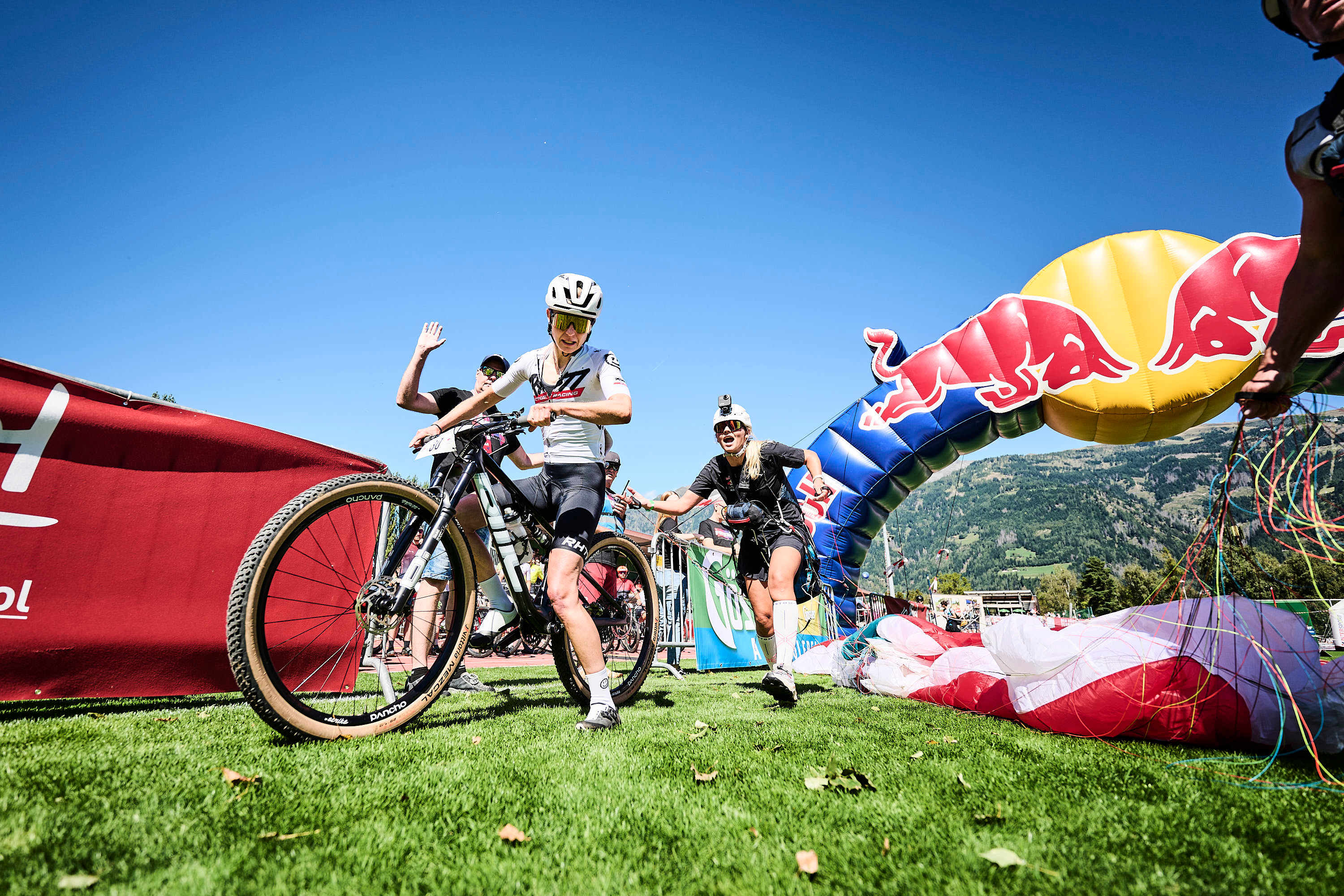 Auch Snowboard-Olympiasieger Benjamin Karl für das Wings for Life Team und Mountainbikerin Elisabeth Osl für das "Team verleiht Flüüügel" verliehen ihren Teams am Mountainbike im wahrsten Sinne des Wortes Flügel und legten all ihr Können in die Waagschale, um mit ihrem Team beim 38. Red Bull Dolomitenmann in Lienz so gut wie möglich abzuschneiden.