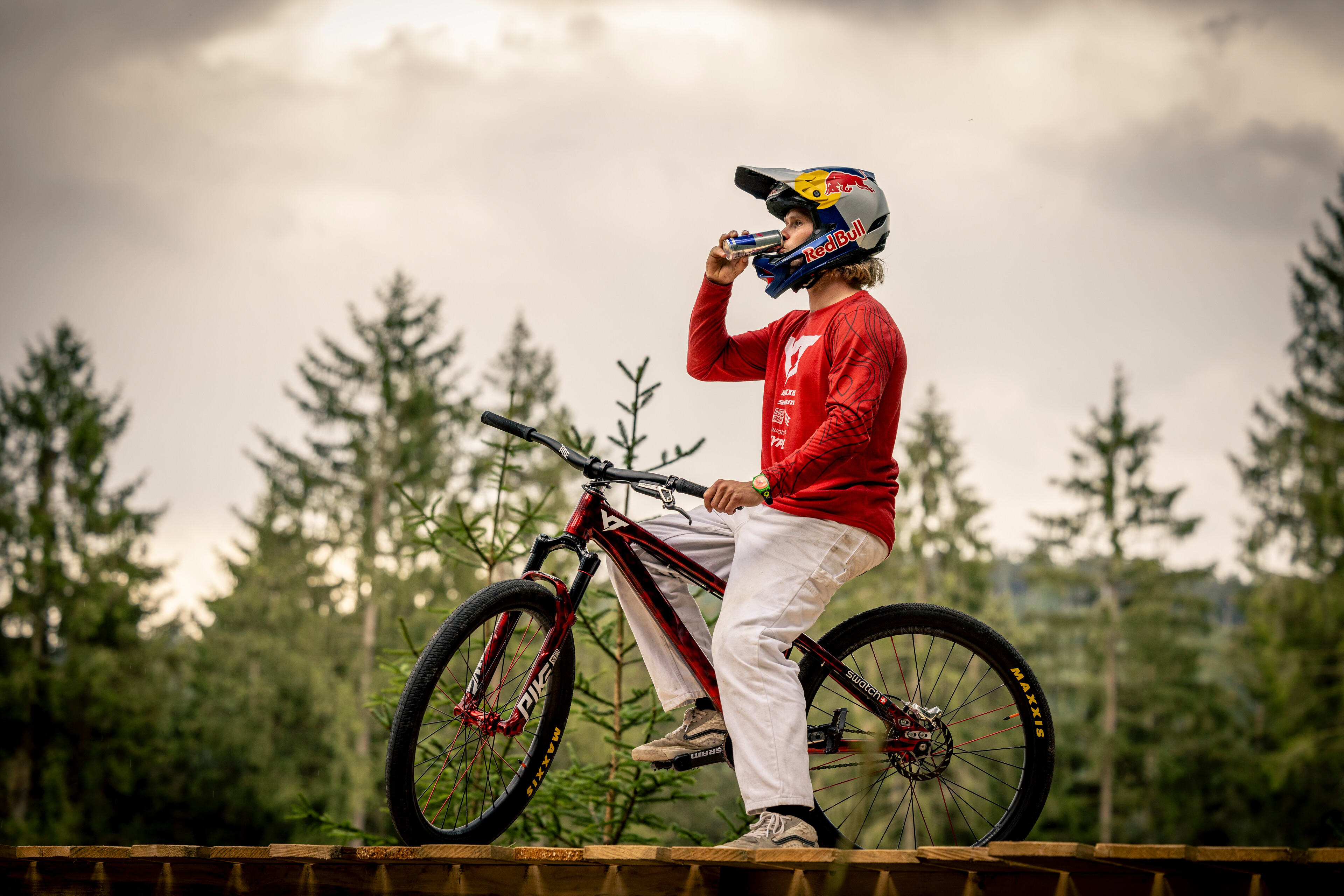 2024 fährt Erik Fedko mit einem Red Bull Mountainbike im Bikepark Green Hill in Deutschland für das Projekt "Above The Trees"