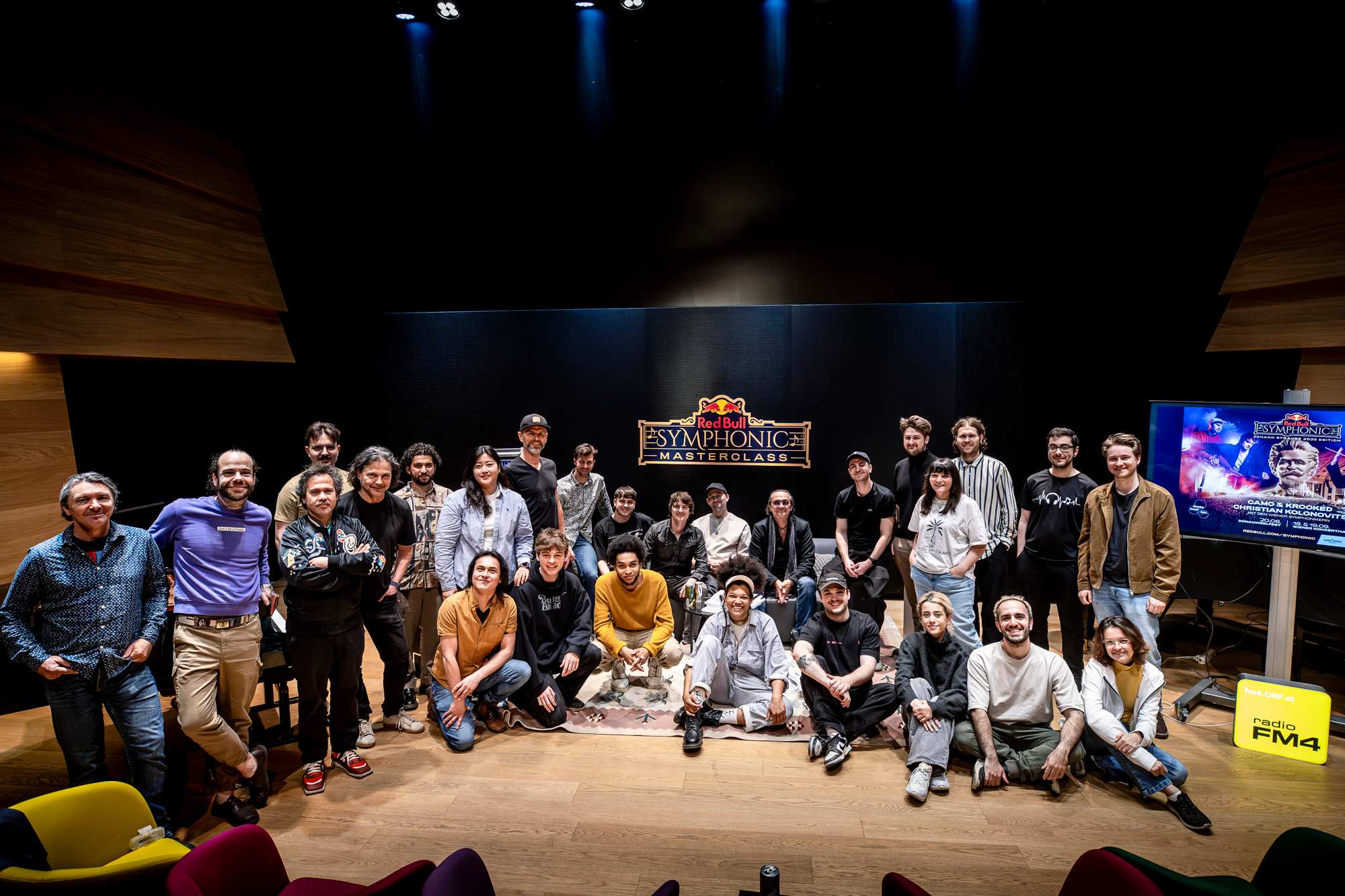 Die geladenen Producer:innen – unter anderem über Ausschreibung von FM4 ausgewählt – und Studierenden für Komposition an der mdw tauchten tief in den Schaffensprozess dieser drei Musik-Visionäre ein. Sie erhielten in spannenden Sessions mit Camo & Krooked exklusive Einblicke in die neuentstandenen Tracks Christian Kolonovits erzählte inspirierende Anekdoten aus seiner Arbeit mit Luciano Pavarotti, Wolfgang Ambros oder den Scorpions und über die Transformation des Donauwalzers in Moll. Gemeinsam wurden ausgewählte Johann Strauss Stücke und Camo & Krooked Tracks in ihre Einzelteile zerlegt, um die Teilnehmer:innen auf die Reise von Red Bull Symphonic – Johann Strauss 2025 Edition mitzunehmen.