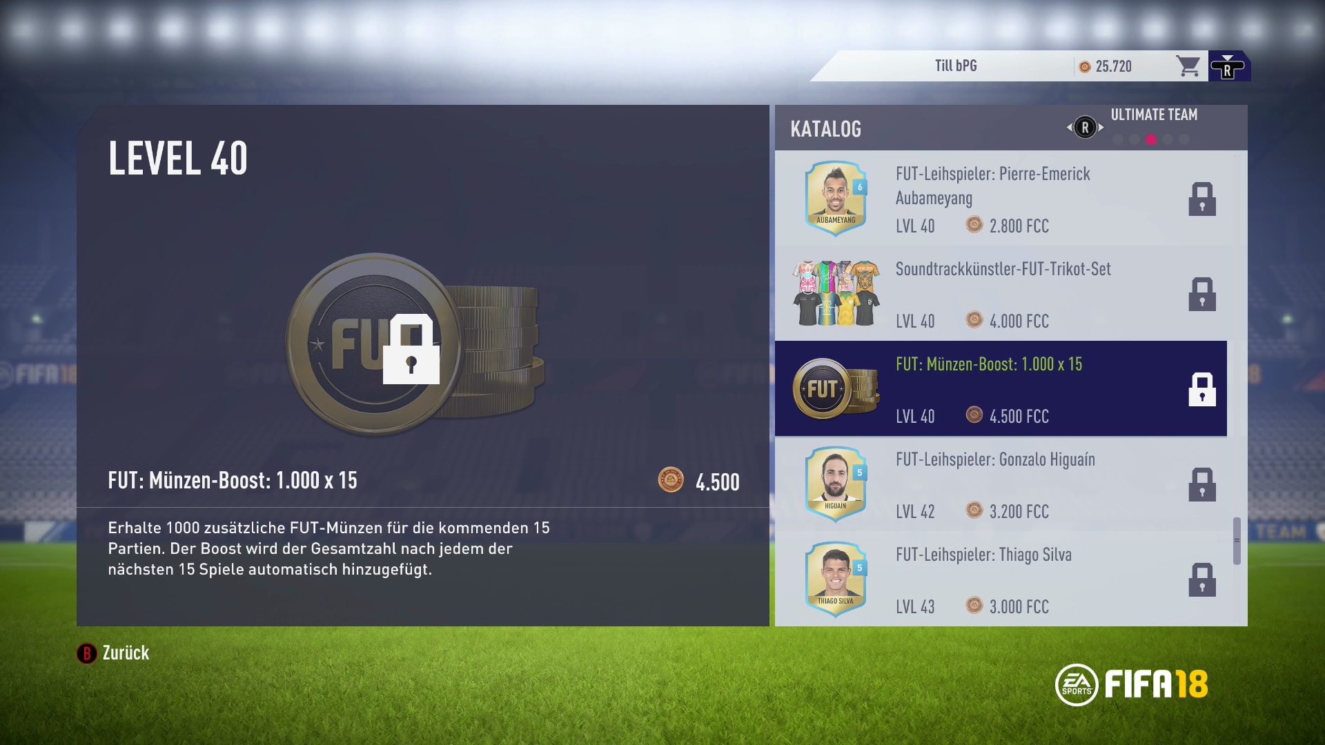 Nachdem ihr FIFA 18 gestartet habt, könnt ihr mit Drücken des rechten Sticks den EA Sports Katalog öffnen. Dort gibt es abhängig von eurem Level verschiedene Belohnungen - unter anderem den Coinboost. Mit diesem Boost erhaltet ihr für jedes absolvierte Spiel mehr Münzen. Vor allem in den ersten Wochen nach Release lohnt sich das besonders! Statt 500 Coins pro Spiel könnt ihr beispielsweise gleich 1500 Münzen absahnen. Im Katalog gibt es übrigens auch weitere nützliche Boni für FUT, zum Beispiel eine Erweiterung der Transferliste, Leihspieler, Trikots und Verträge.