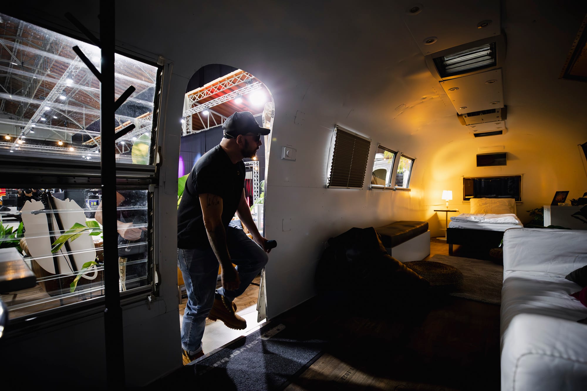 In einer Ecke stehen drei voll ausgestattete Camper, denen an Interieur nichts fehlt. Wohnzimmer, Küche, Bad und das Herzstück - eine Probebühne - sind natürlich auch vorhanden.