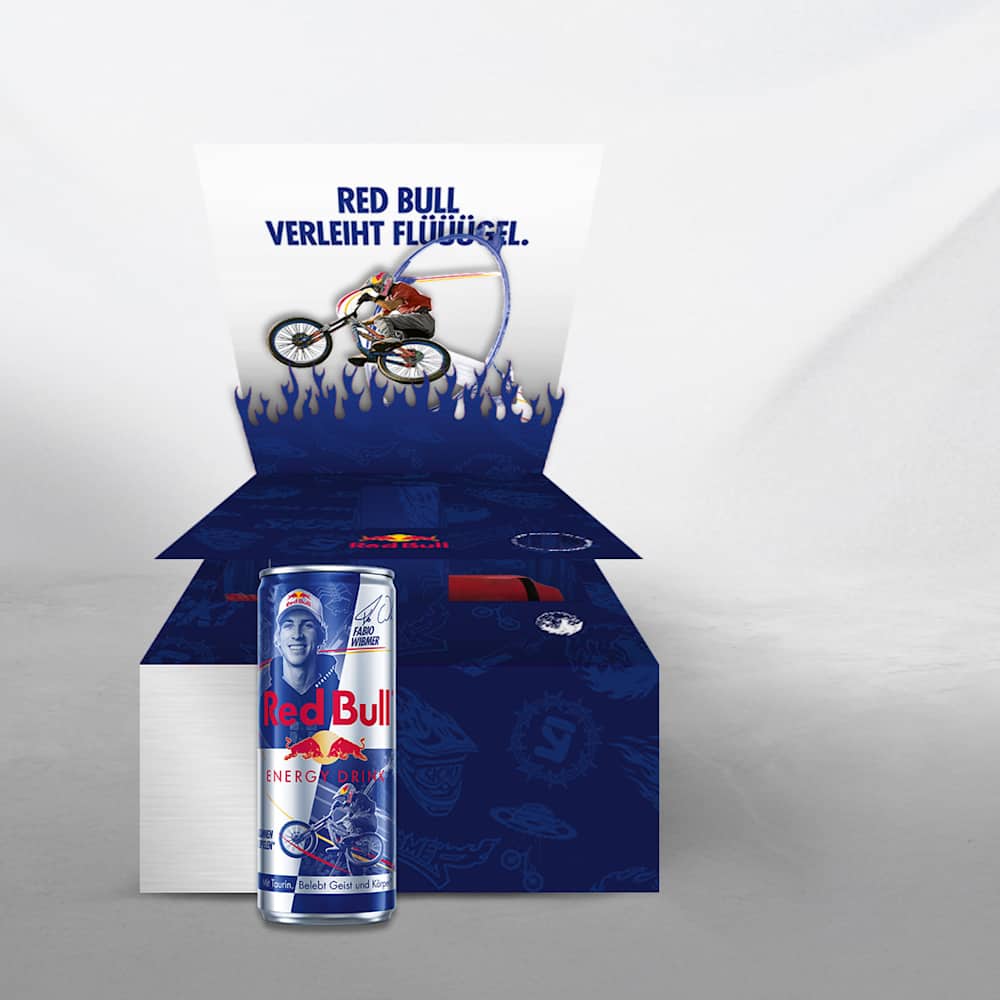 Jede Box enthält eine Dose Red Bull Energy Drink, in der limitierten Fabio Wibmer Edition, eine Autogrammkarte und eine Überraschung von Fabios Brand Nineyard