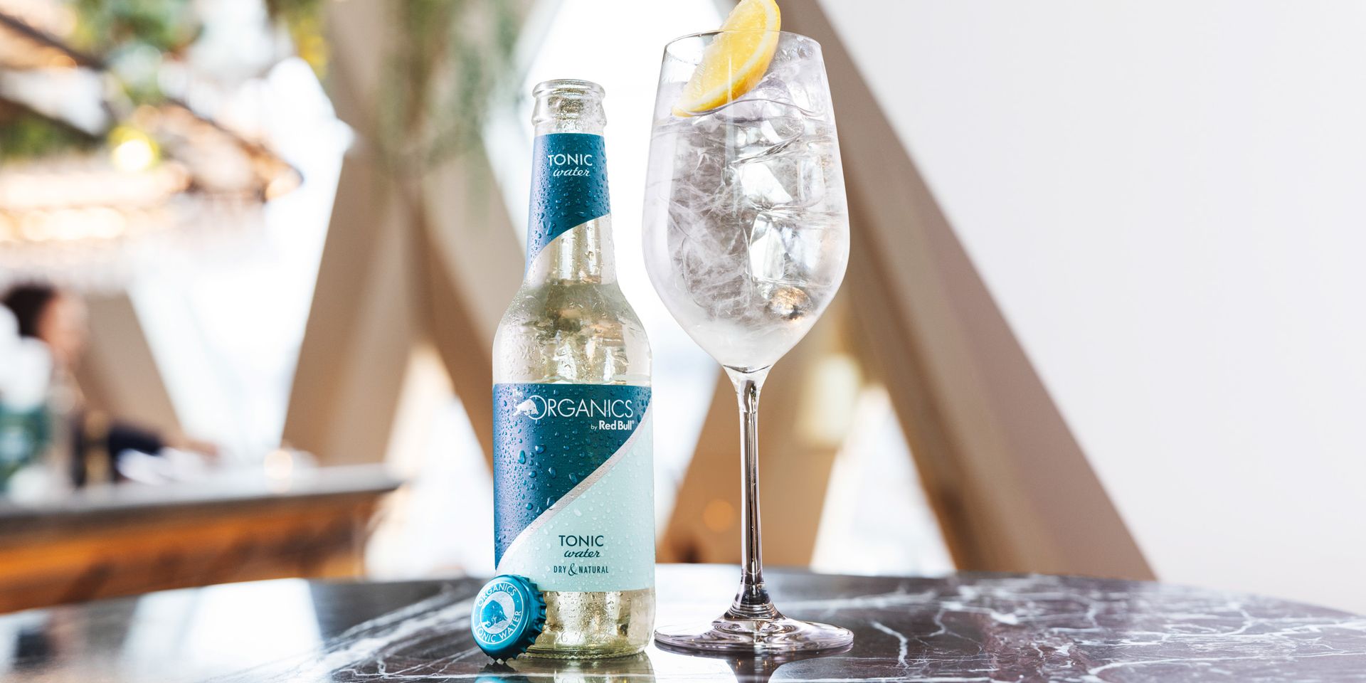 Cocktail mit ORGANICS Tonic Water by Red Bull mit Gin und Limettenscheiben zur Garnierung.