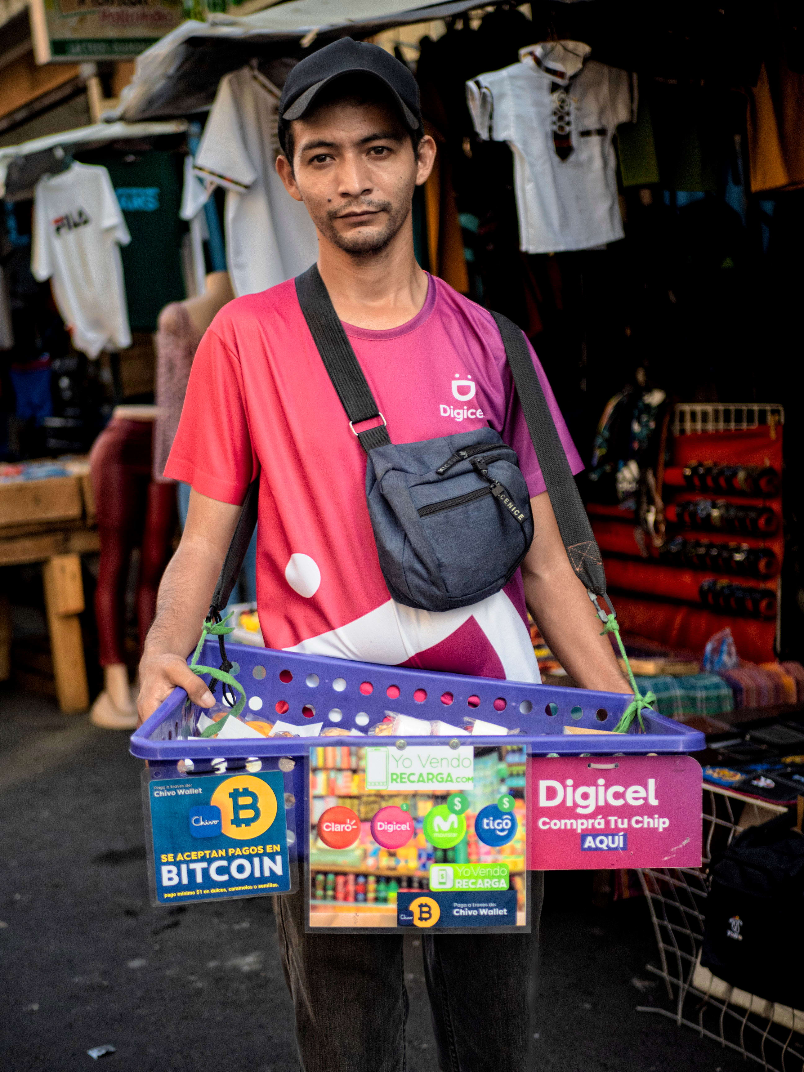 Dazu der allgegenwärtige fiepsigblecherne Sound von bunt blinkendem Plastikspielzeug. Es ist ein neonerleuchtetes Labyrinth aus Wäsche, Essen und Alltagswaren, und Melvin David Hernandez Esquivel ist ein Teil davon. Der 35-Jährige verkauft hier aus seinem schiefen Bauchladen heraus Kaugummis, Bonbons und kleine Säckchen mit Nüssen. Damit macht er am Tag vierzig Dollar Umsatz; seit er auch Bitcoin als Zahlungsmittel nimmt, ist es etwas mehr.