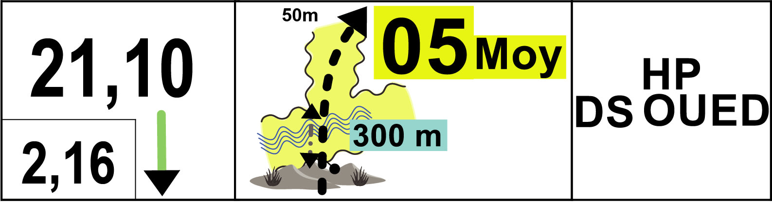 Bei Kilometer 21,1, das ist 2,16 Kilometer nach der letzten Anweisung, geht es bergab durch mit Büschen durchsetzte Dünen und einen 300 Meter breiten Fluss. Danach muss ich mich leicht rechts offroad in ein etwa 50 Meter breites Wadi (ausgetrockneter Flusslauf, frz. oued) einfädeln, Kompasskurs durchschnittlich (Moy = frz. moyen) fünf Grad.
