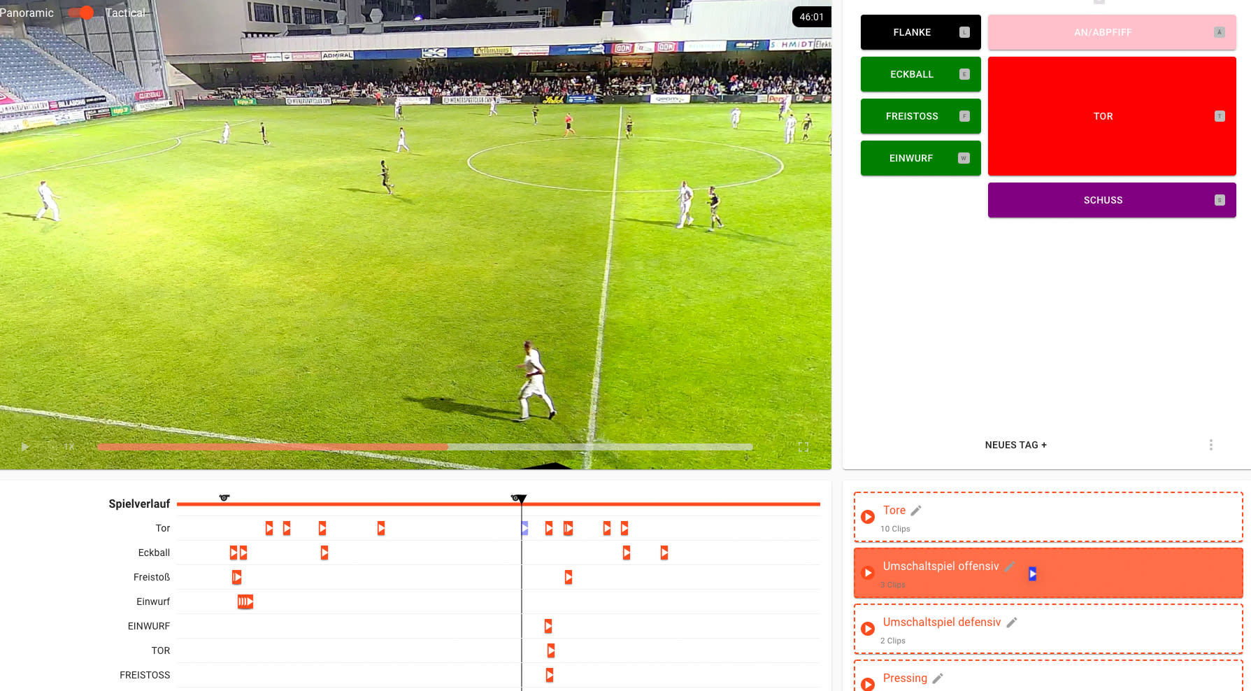 „Wir sind dann zu Vereinen gegangen, die fanden das interessant – aber sie hatten gar keine eigenen Videoaufnahmen. Da hat höchstens mal ein Betreuer mit dem Handy mitgefilmt", erzählt Simon Schmiderer. So entstand die Idee, zusätzlich zur KI ein simpel zu installierendes Plug-and-play-Videosystem anzubieten. Die Kamera filmt durchgehend das gesamte Feld, „weil Fehler ja nicht immer nur da passieren, wo der Ball grad ist", bei der Analyse kann man zwischen Panorama-Modus und einzelnen Spielszenen hin- und herwechseln.