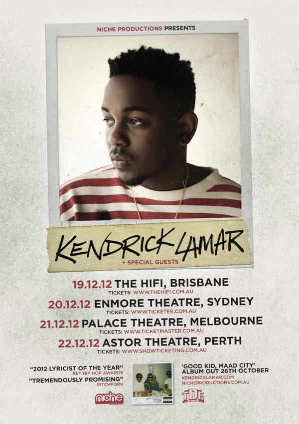 Soon after Kendrick Lamar released his debut album, Section.80, the Sydney-based touring agency Niche Productions booked the rapper for a run of Australian shows in December 2012. Niche announced the tour in the same week that Lamar dropped his second album, good kid, m.A.A.d city. The timing couldn't have been better.