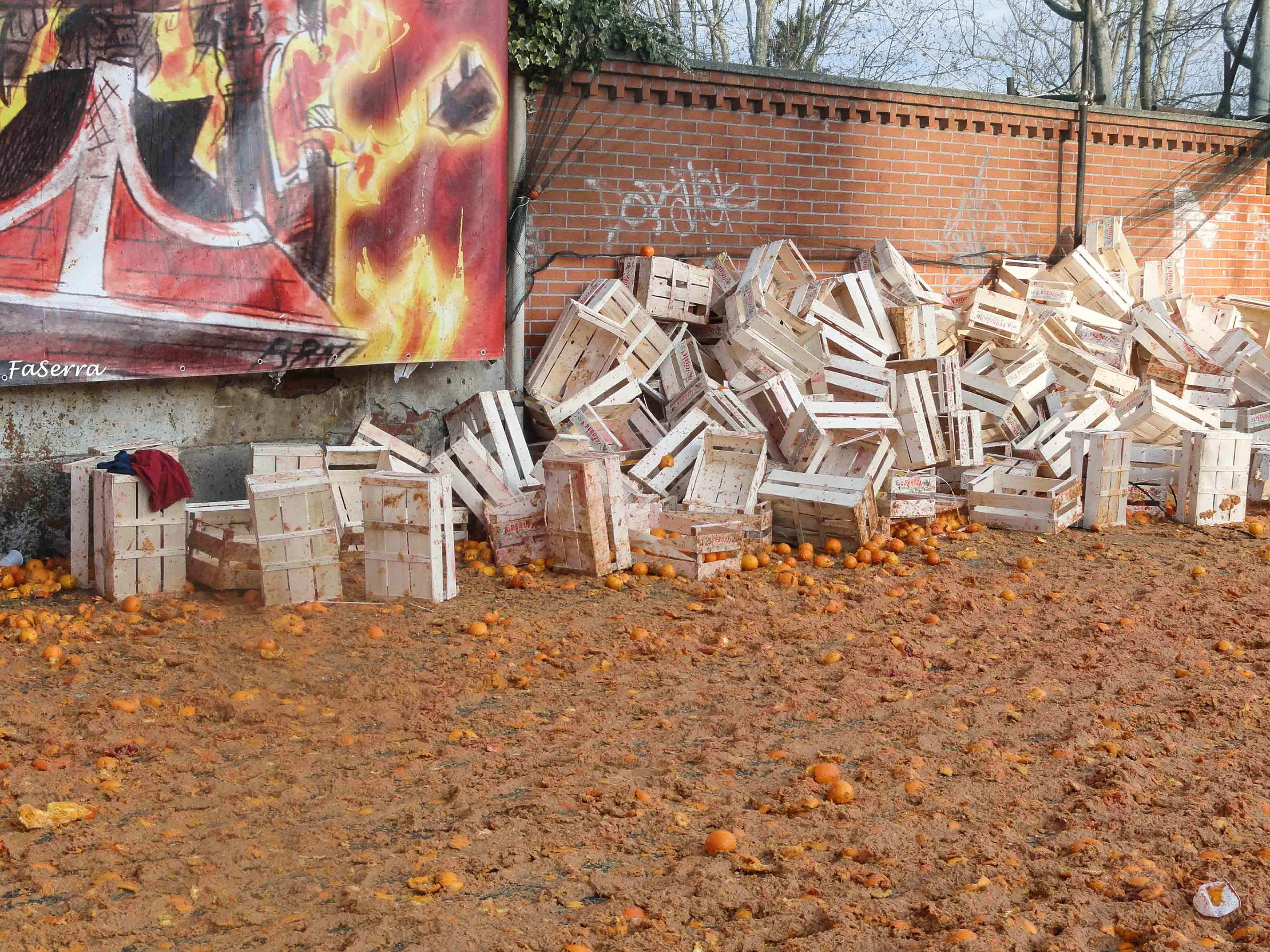 When the festival begins, your team’s job is basically to defend its territory against the metaphorical ‘soldiers of the tyrant’. In this case, the soldiers are other Ivreans, riding around in horse-drawn chariots, pelting you and your family with large oranges. You respond by throwing oranges back as hard as you bloody well can. And so on and so on, oranges whizzing through the air like stinger missiles, mashing into unprotected necks and groins and faces.