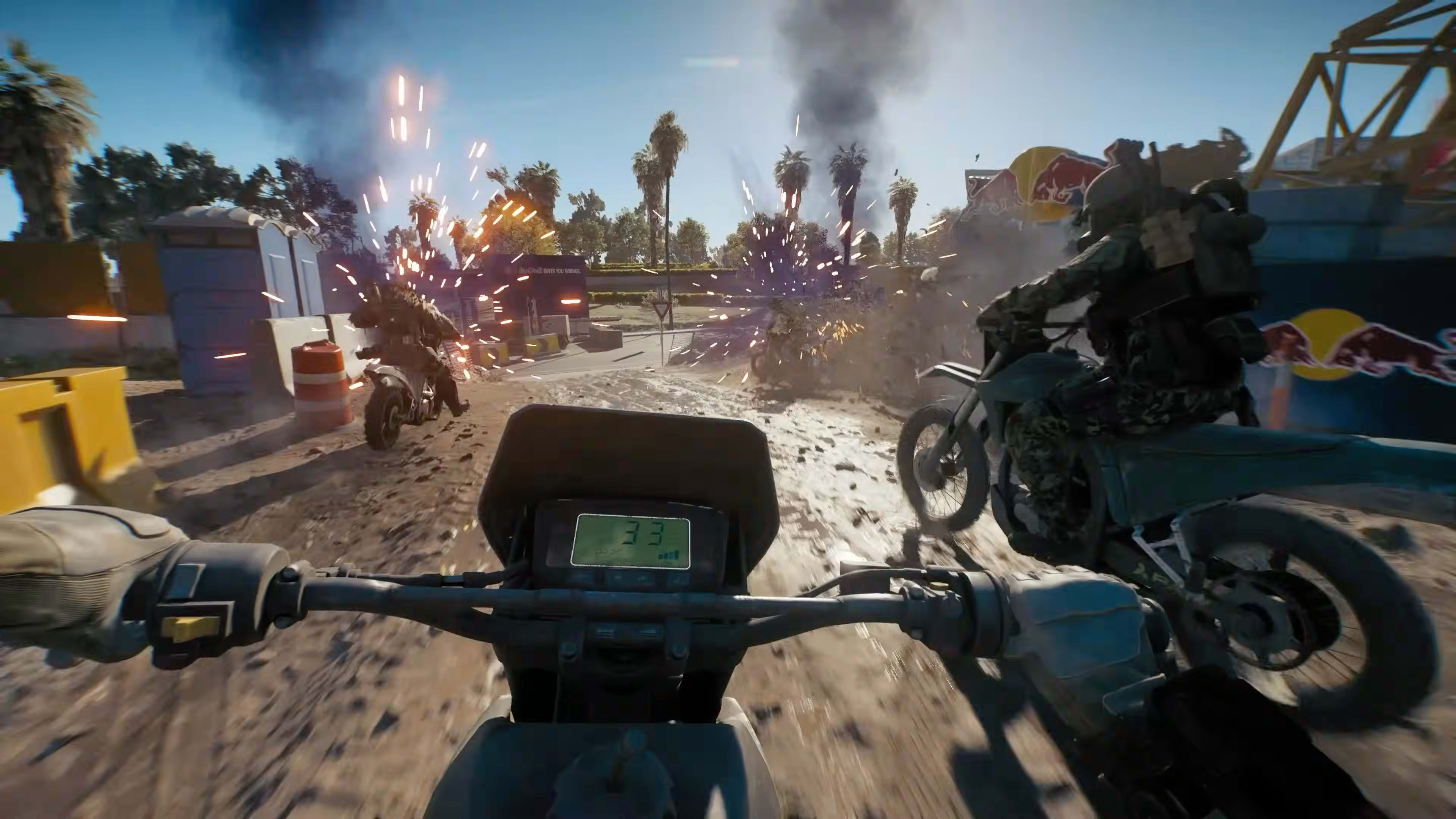 Motorcyclists race in a scene from Battlefield 6's REDSEC.