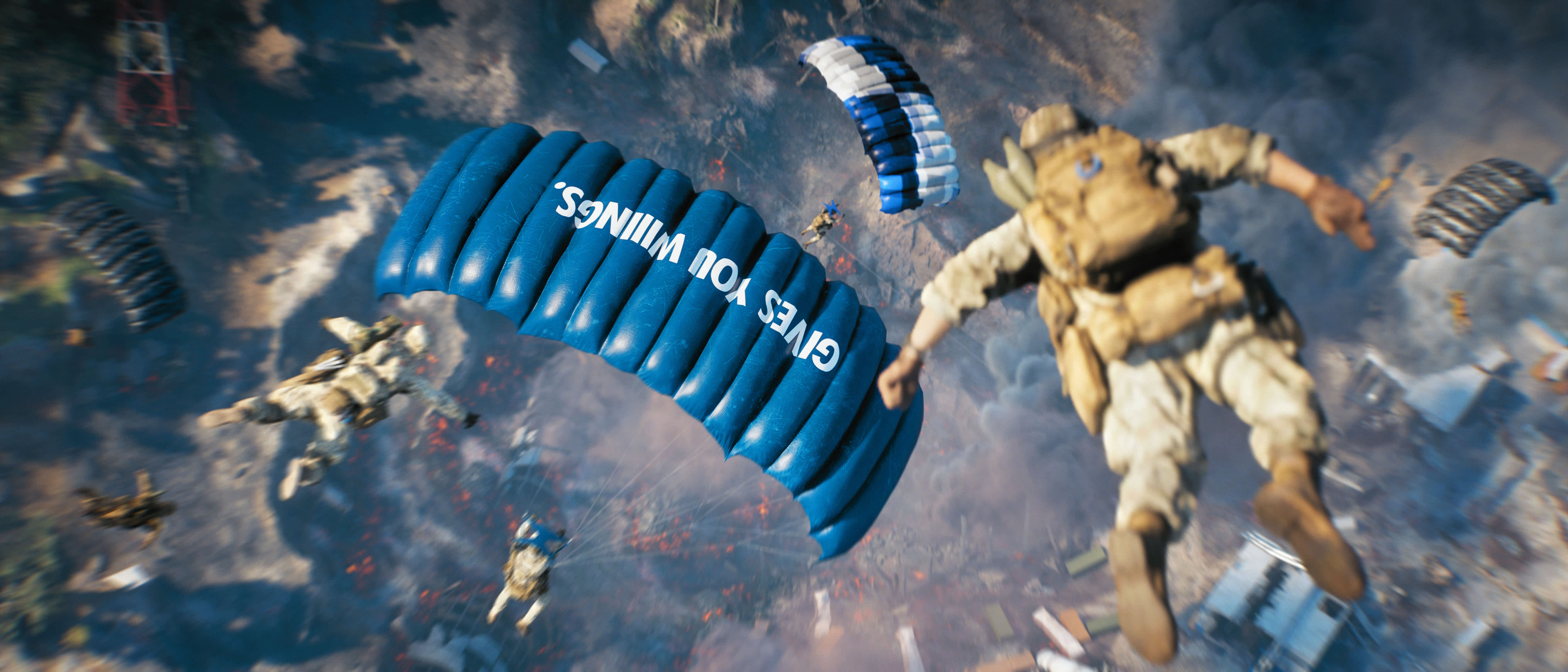 Skydivers with Red Bull-branded parachutes in a scene from Battlefield 6's REDSEC.