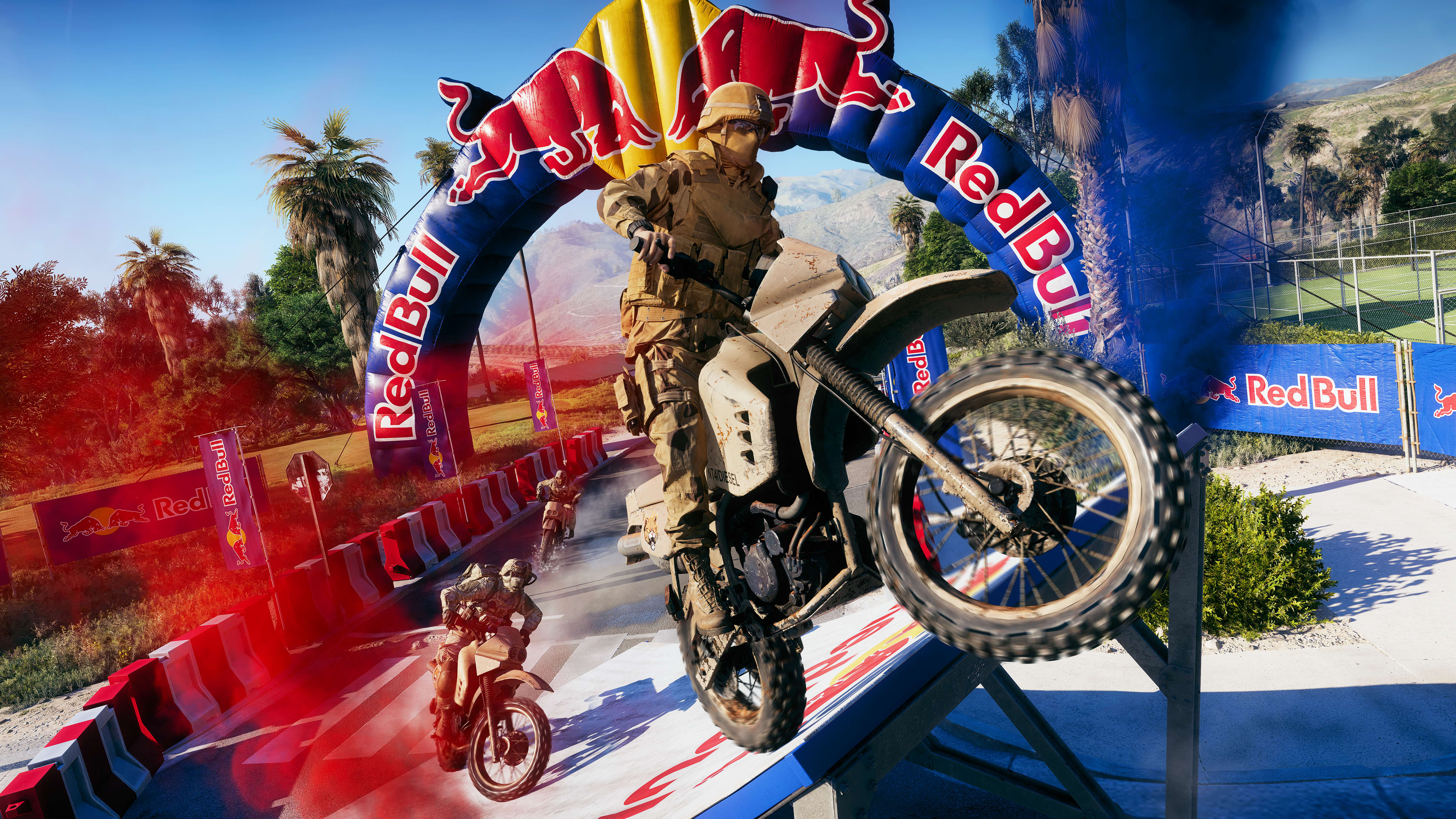 Motorcyclists race through an inflatable Red Bull arch in a scene from Battlefield 6's REDSEC.