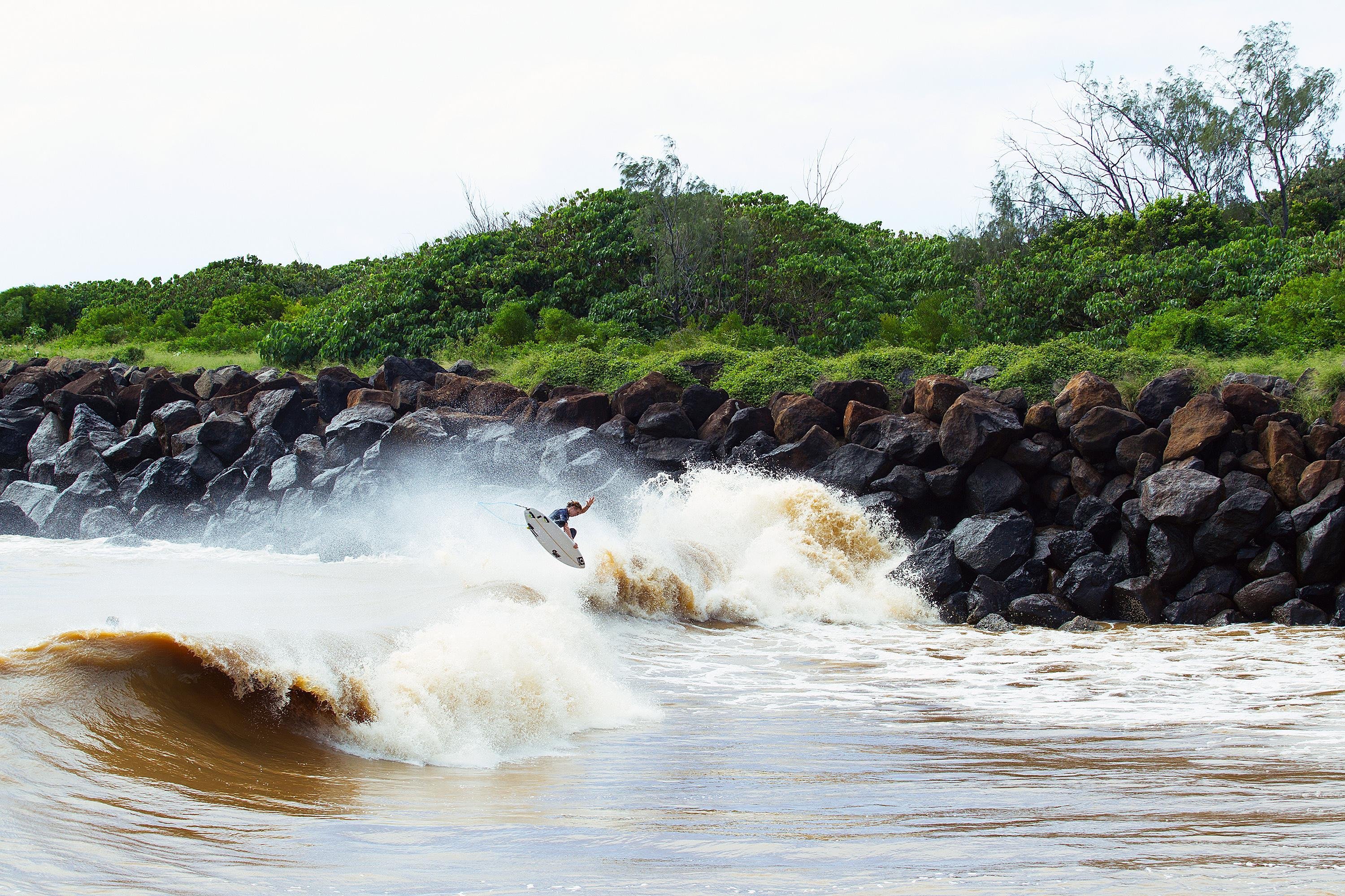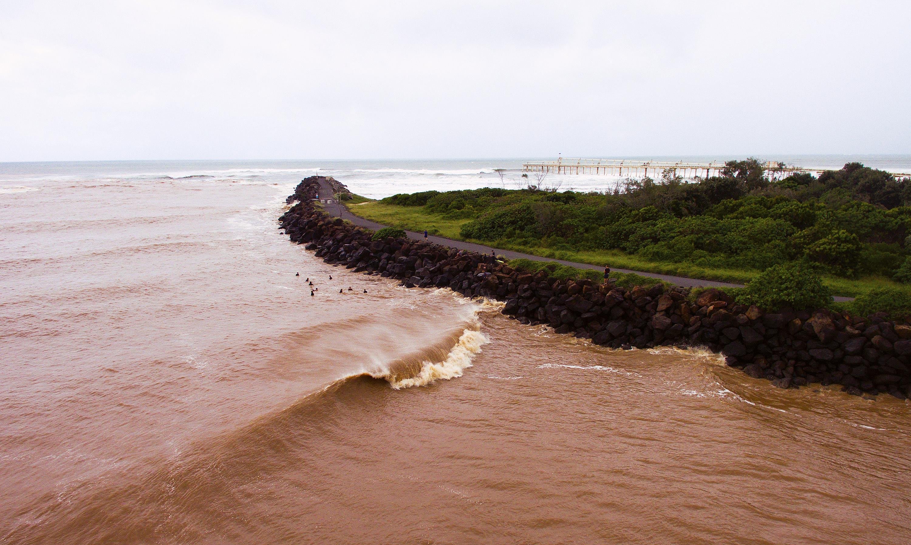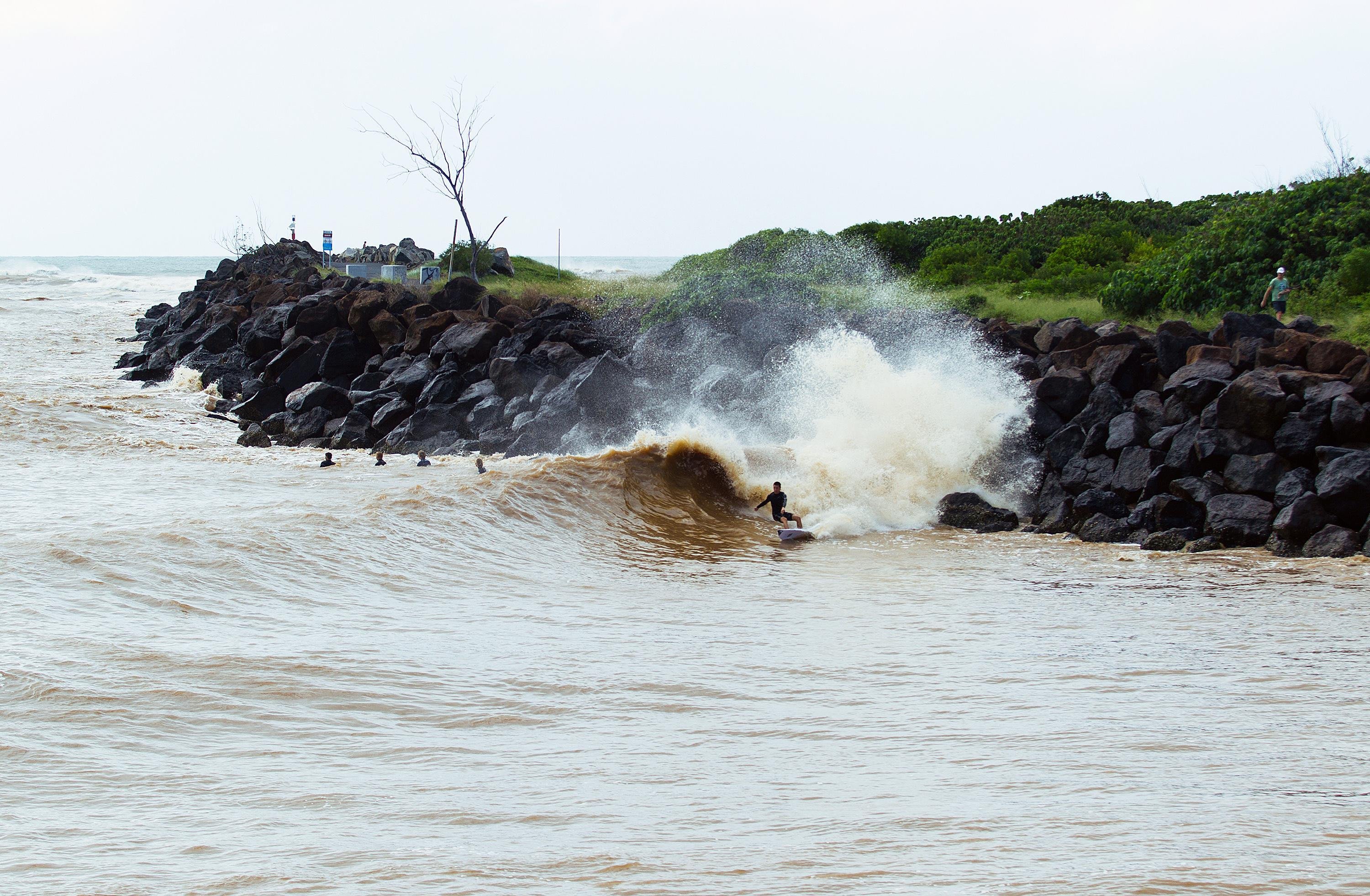 “When I saw what was happening, I knew what was GOING to happen,” he explains. “When it rains this heavily, the shallow sand bank along the southern rock wall of the Tweed River starts doing something very rare – it turns into every Cooly locals favourite novelty wave. This week it has breaking better than usual though, and some proper barrels have been had.