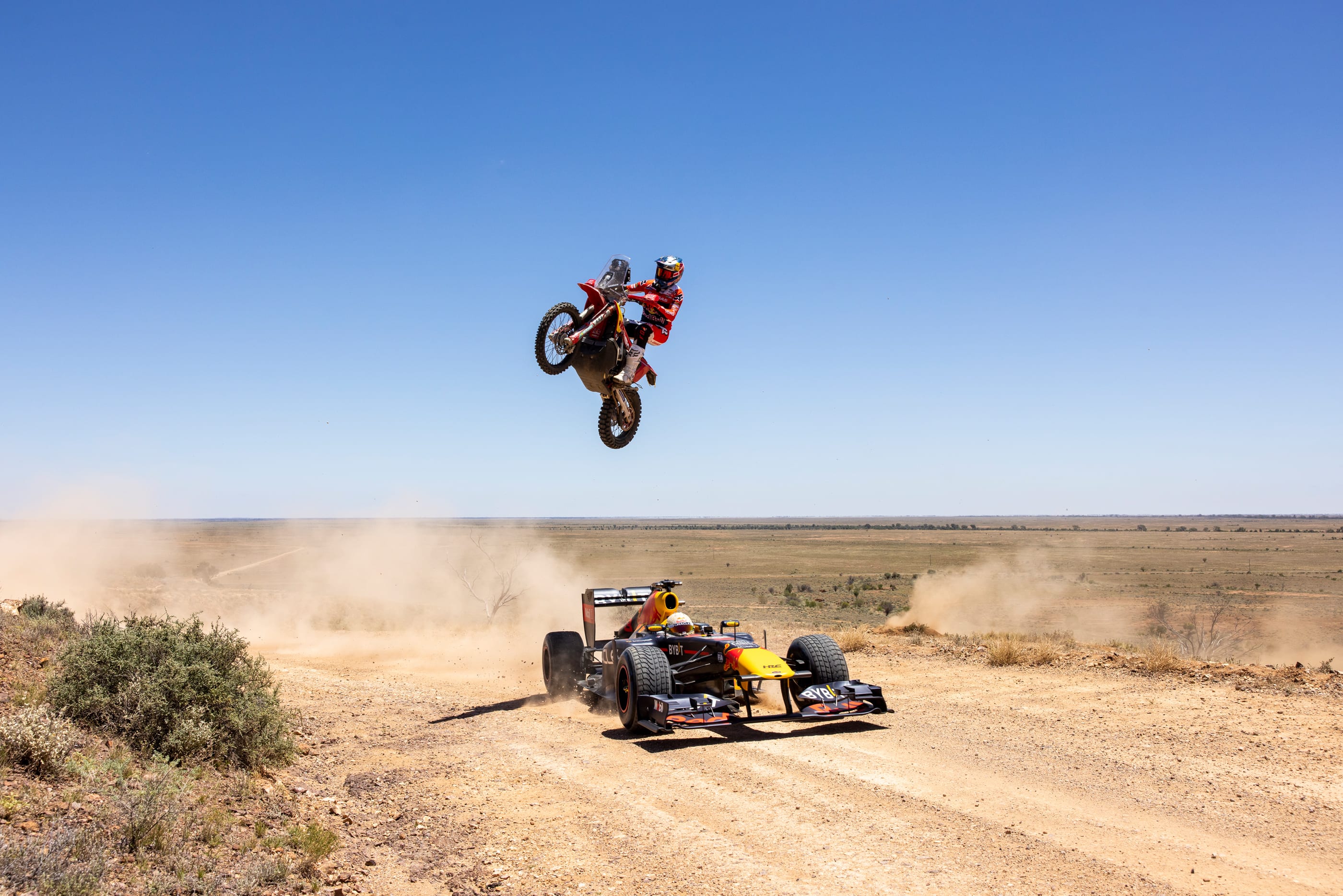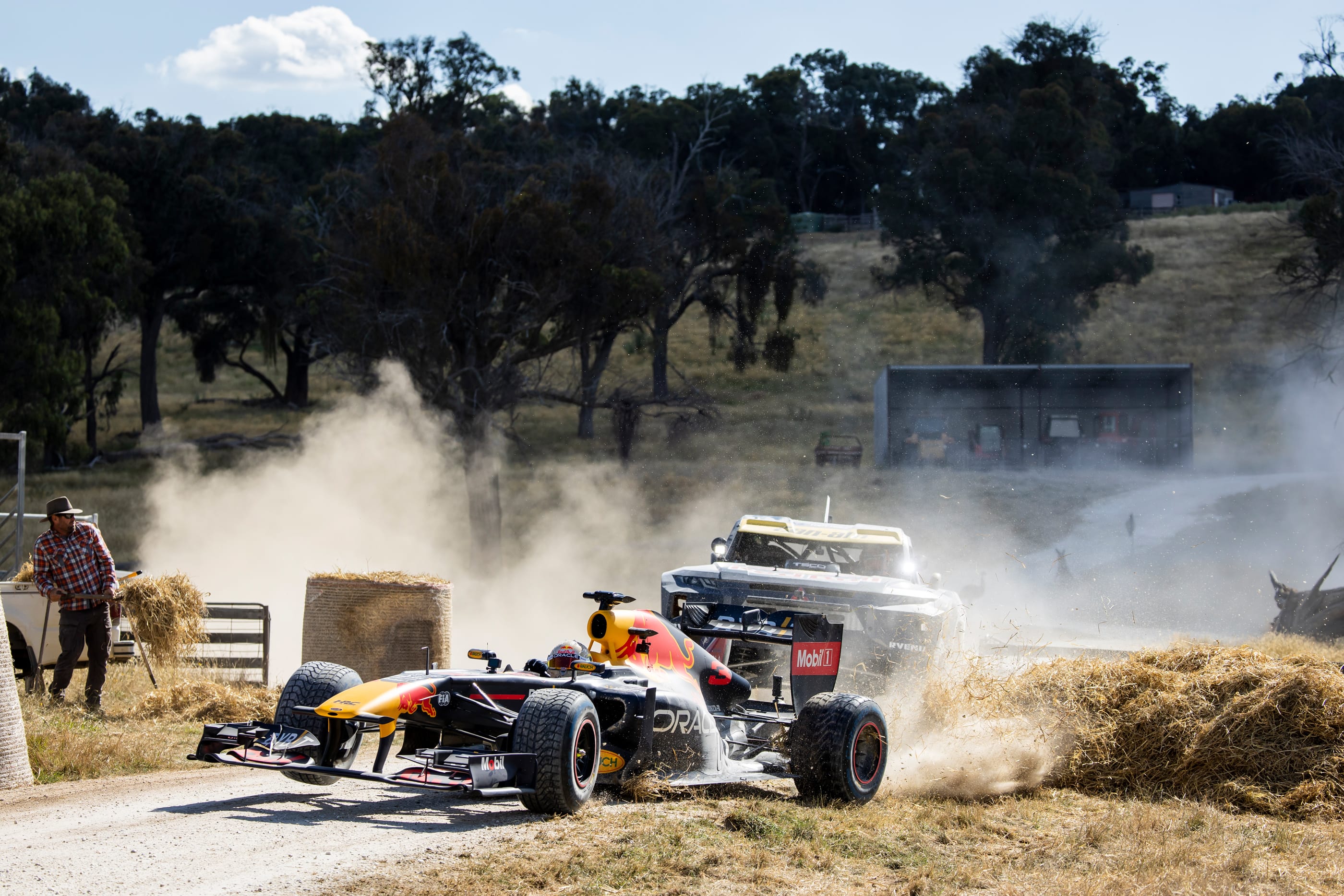 For the third challenge, Aussie Enduro icon Toby Price prepared the ultimate Turn 1 simulation plotted through quintessential Australian farm land and the pair rip through the scene as Price tails Ricciardo in his Trophy Truck.