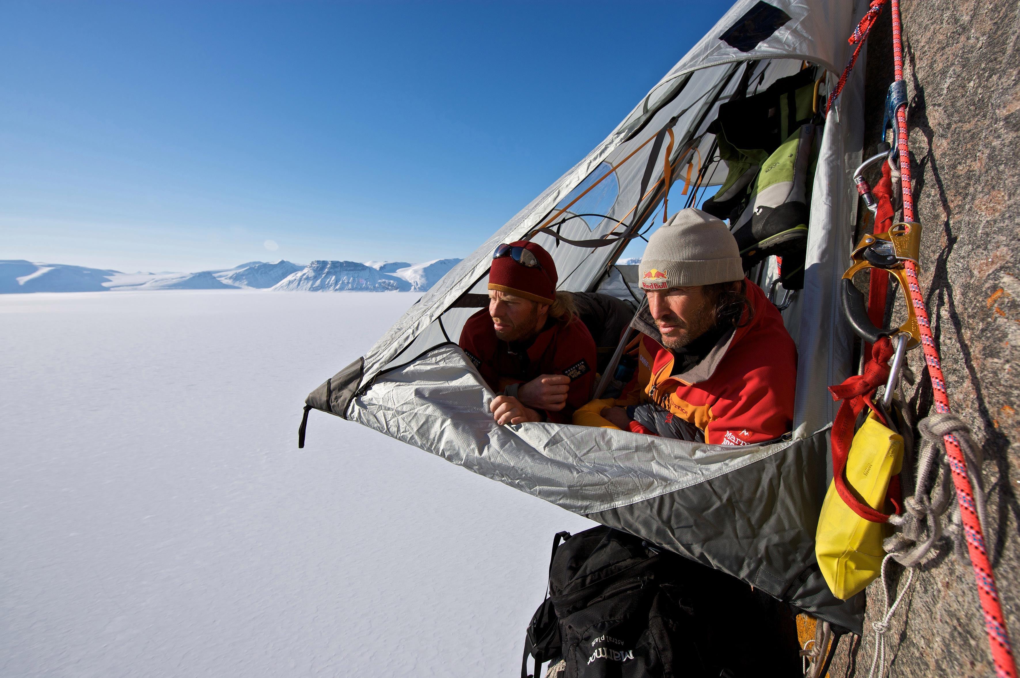 You may have rock to rest your head against but who needs five star hotels when you wake up to views like this? Stefan Glowacz and Robert Jasper enjoy the morning scenery of Canada's Baffin Island's Buchan Gulf.
