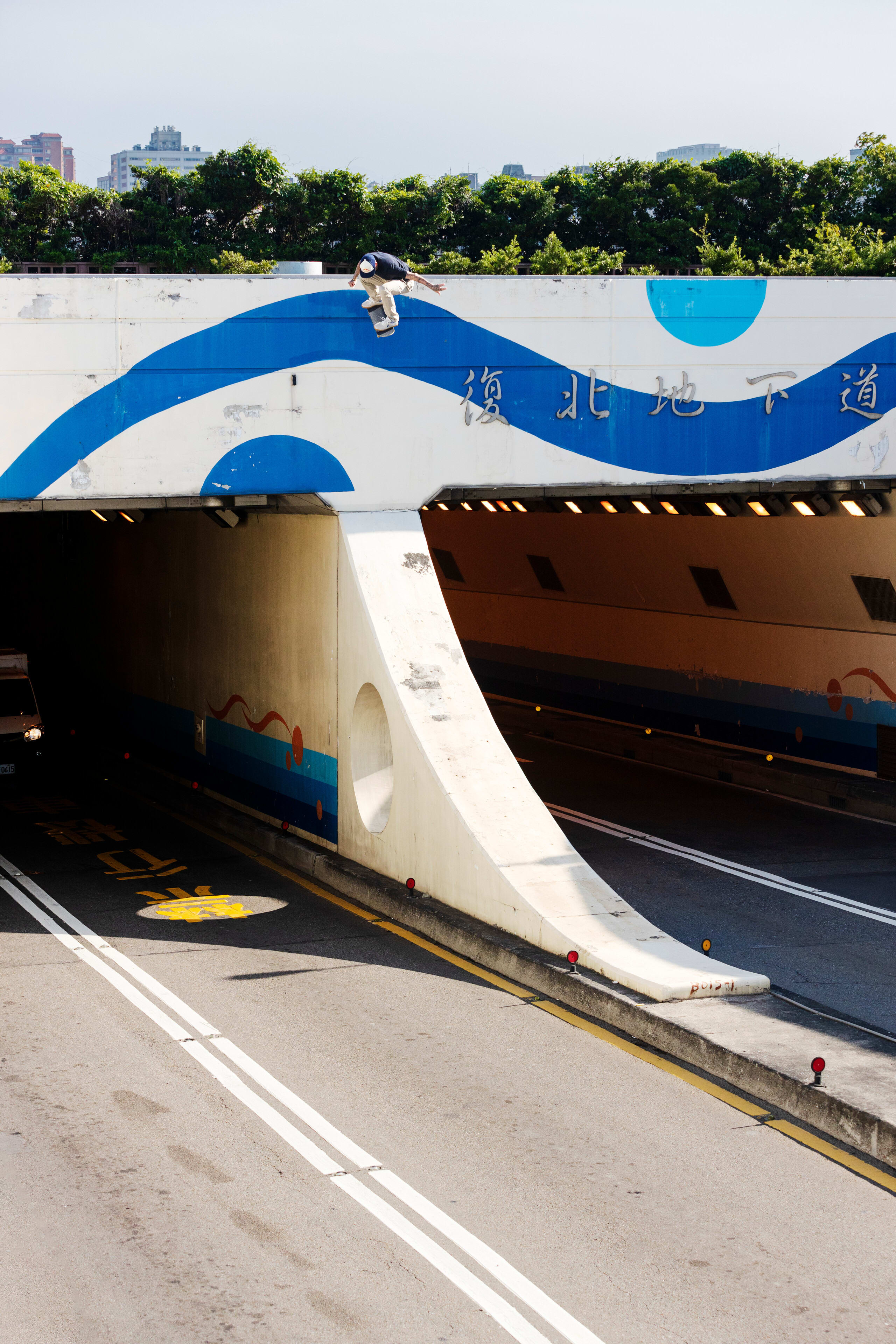 Like the Costco Gap he made famous, which he conquered in 2008 with one of the biggest kickflips ever done. Or the legendary spot at a tunnel exit in the middle of a Taiwanese highway. You drop from a three-meter-high wall into a natural transition that is not even one meter wide. The spot is so huge that a passerby called the police, thinking it was a suicide attempt! But even the police, fire brigade, and ambulance (and the threat of being put in jail if he tried again) didn't put Ryan off, came back and stomped the thing first try!