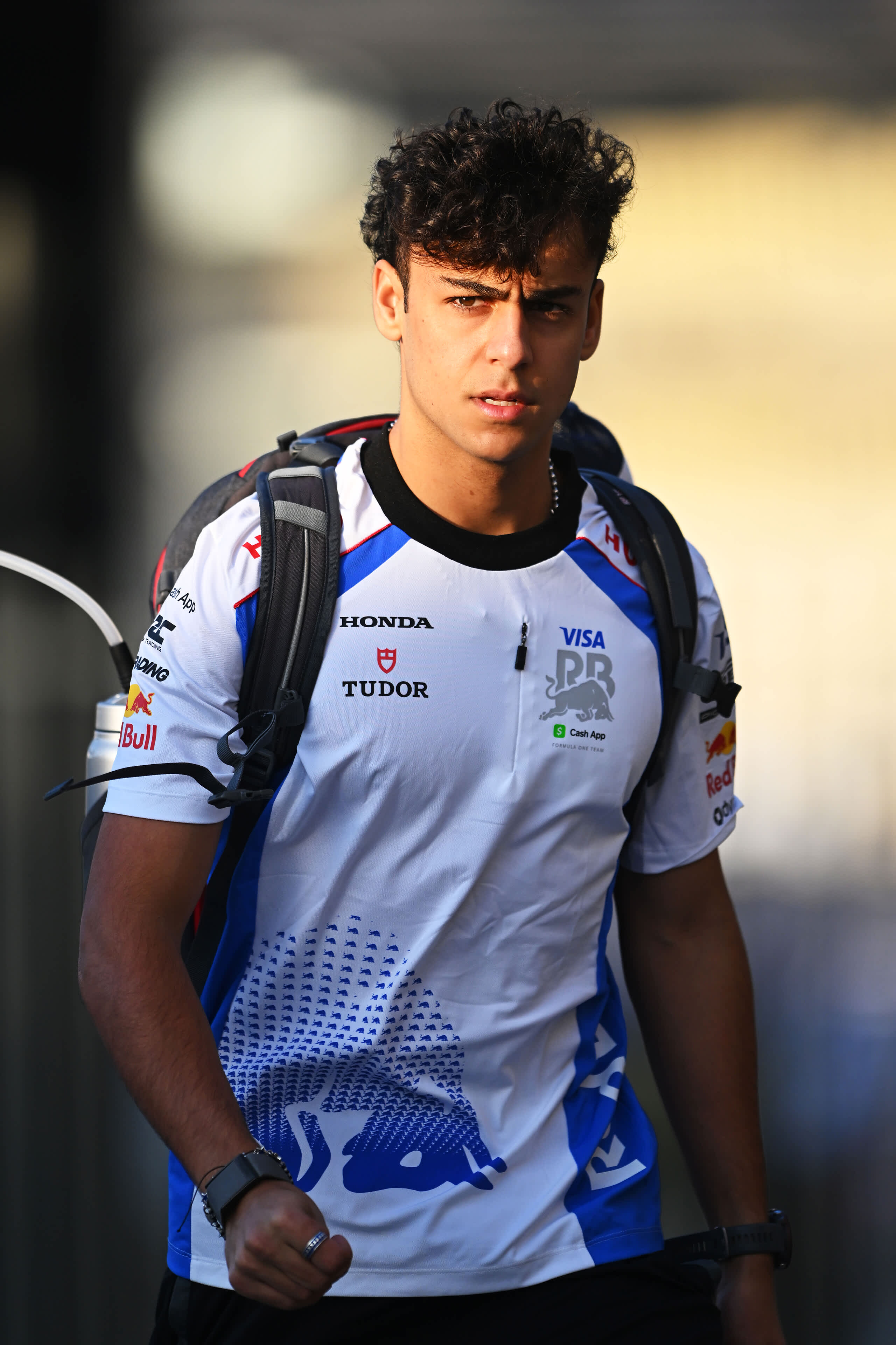 Arvid Lindblad of Great Britain and Visa Cash App Racing Bulls arrives in the Paddock during F1 Testing at Yas Marina Circuit on December 9, 2025.
