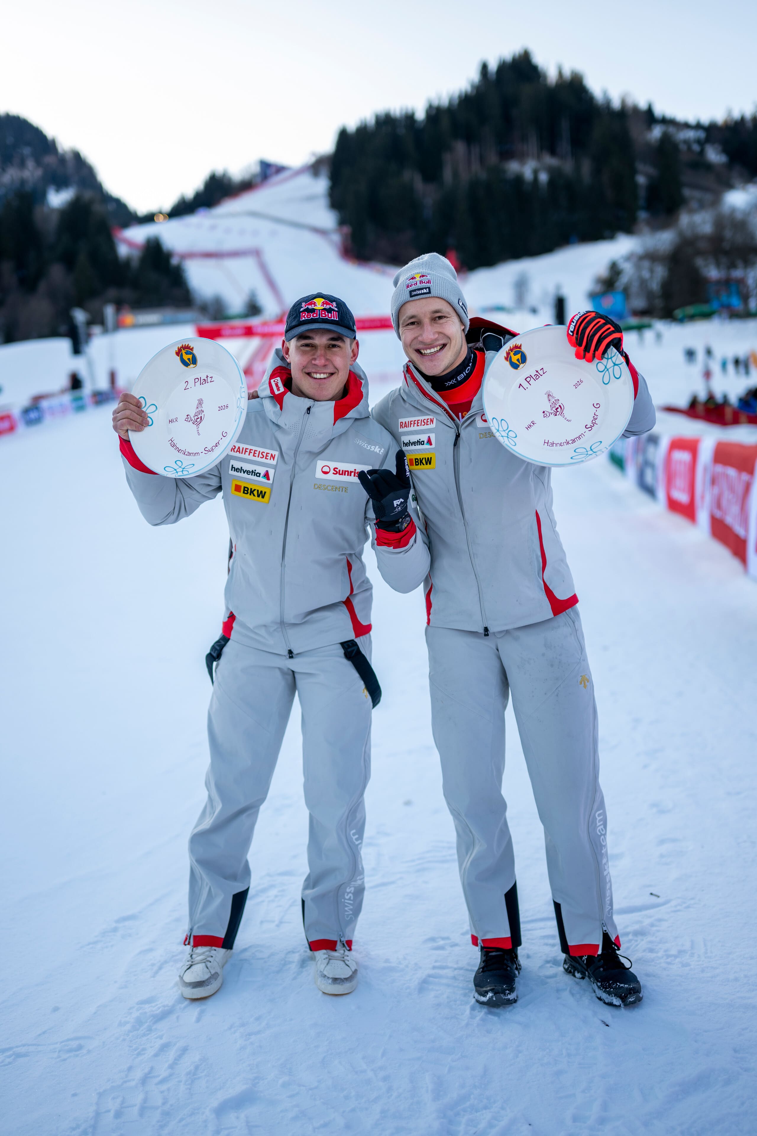 Ski stars Marco Odermatt and Franjo von Allmen revel in their achievements at Kitzbühel, Austria during the 2026 season, proudly sporting Red Bull branding on the snowy podium.