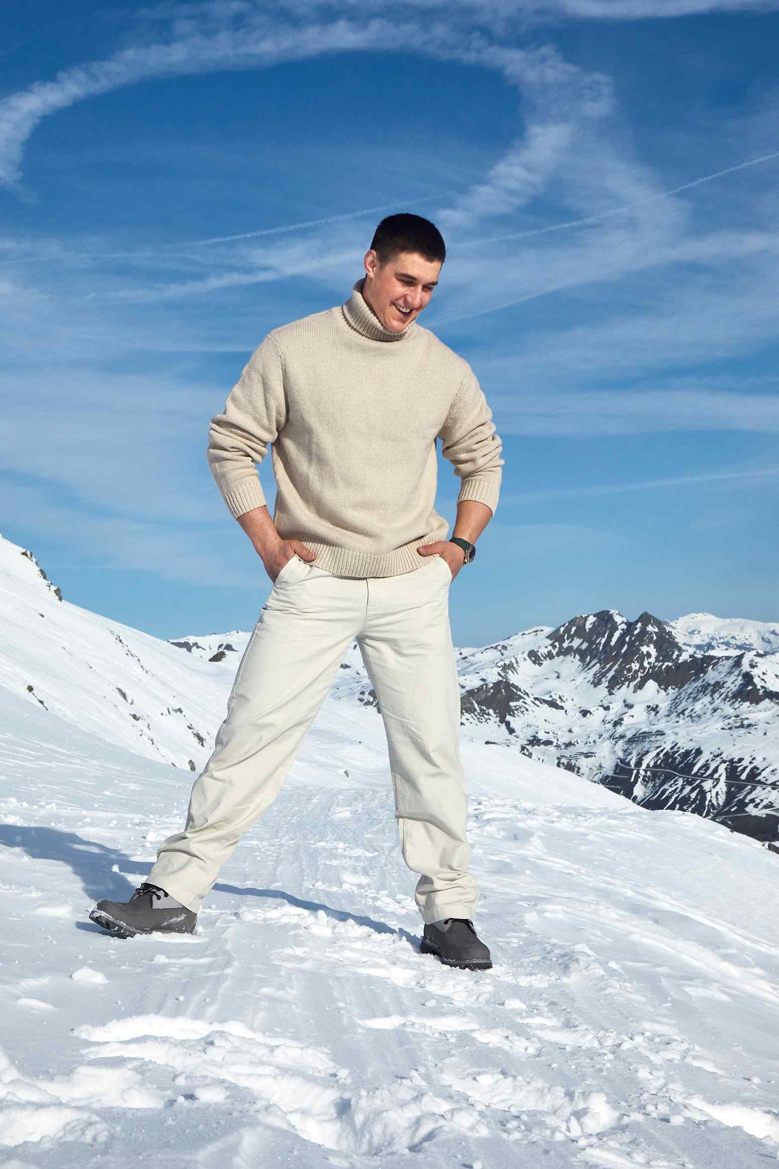Franjo von Allmen in casual clothing during a photo shoot in Zinal, Switzerland in April 2025.