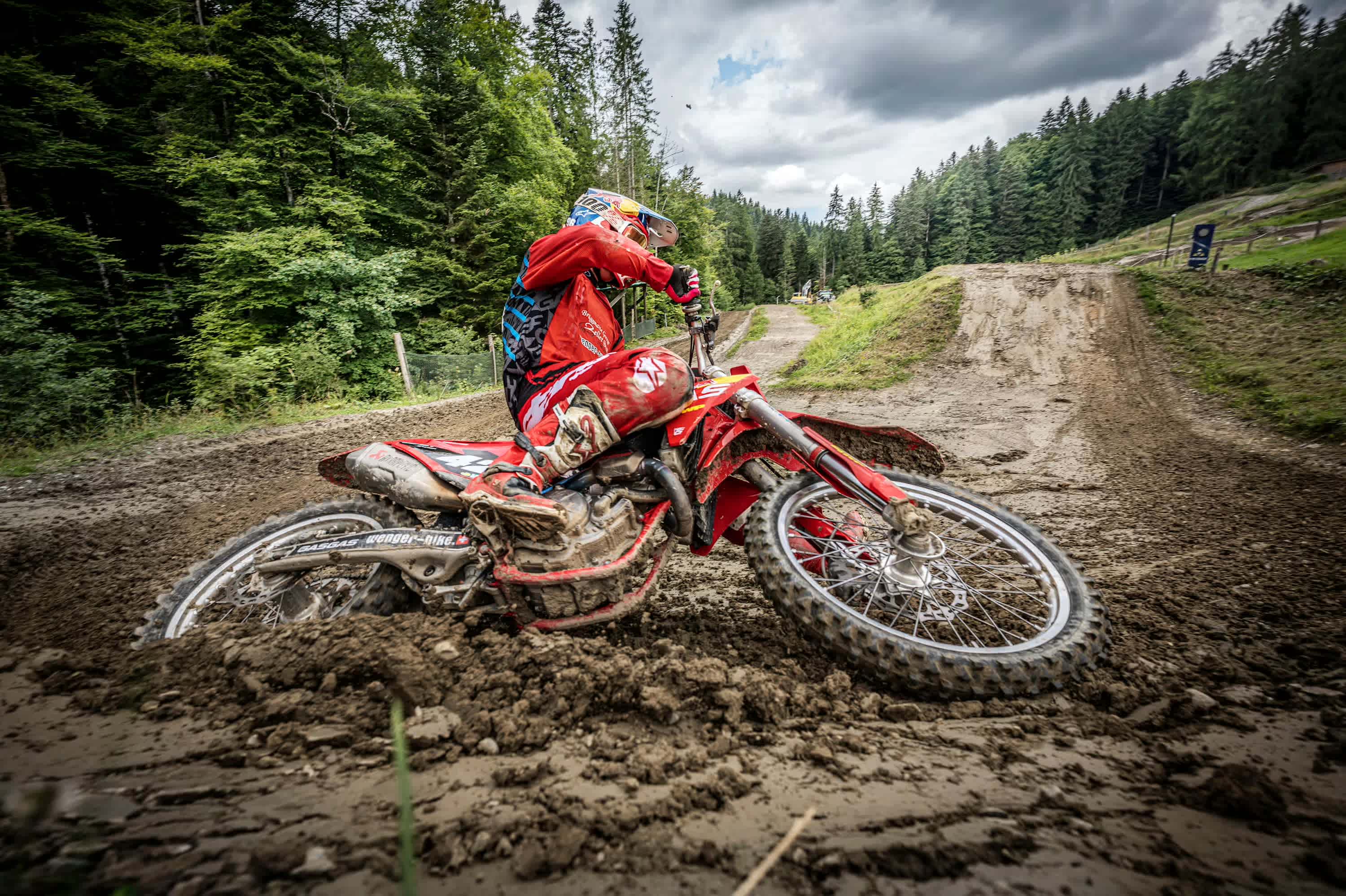 Franjo von Allmen leans into a curve on his motocross bike.