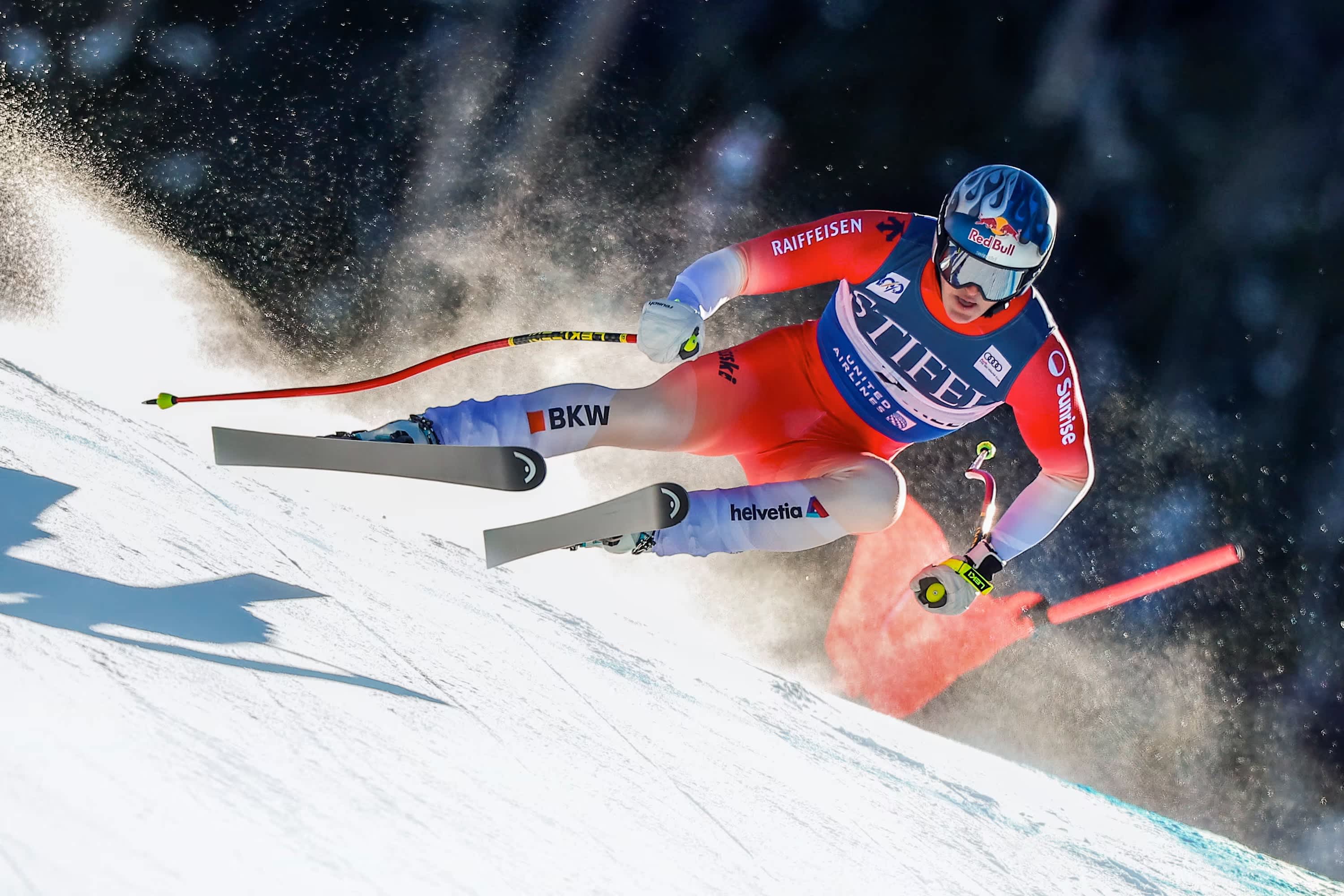 Franjo von Allmen in the 2024 Downhill World Cup race in Beaver Creek, USA